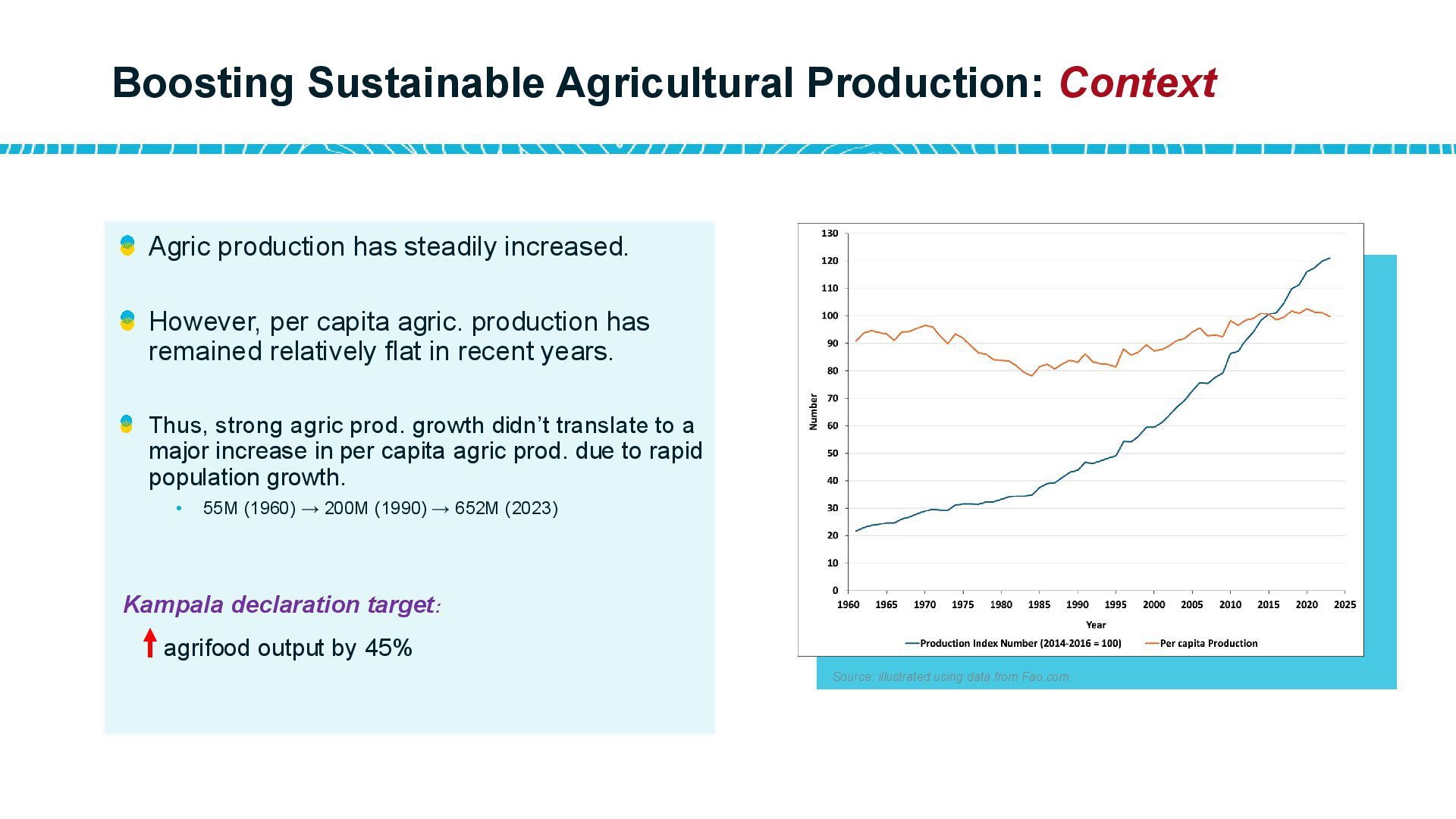 However, per capita agric. production has remained relatively flat in recent years. Thus, strong agric prod. growth didn’t translate to a major increase in per capita agric prod. due to rapid population growth. • 55M (1960) → 200M (1990) → 652M (2023) Kampala declaration target: agrifood output by 45% Source: illustrated using data from Fao.com