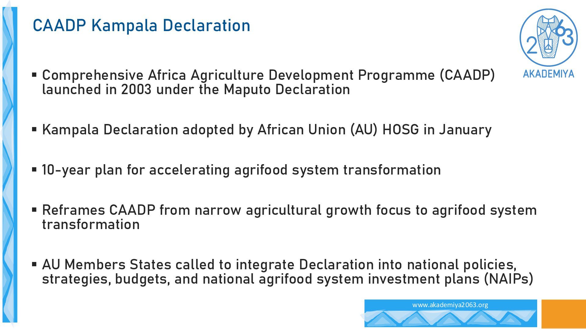 (CAADP) launched in 2003 under the Maputo Declaration ▪ Kampala Declaration adopted by African Union (AU) HOSG in January ▪ 10-year plan for accelerating agrifood system transformation ▪ Reframes CAADP from narrow agricultural growth focus to agrifood system transformation ▪ AU Members States called to integrate Declaration into national policies, strategies, budgets, and national agrifood system investment plans (NAIPs)