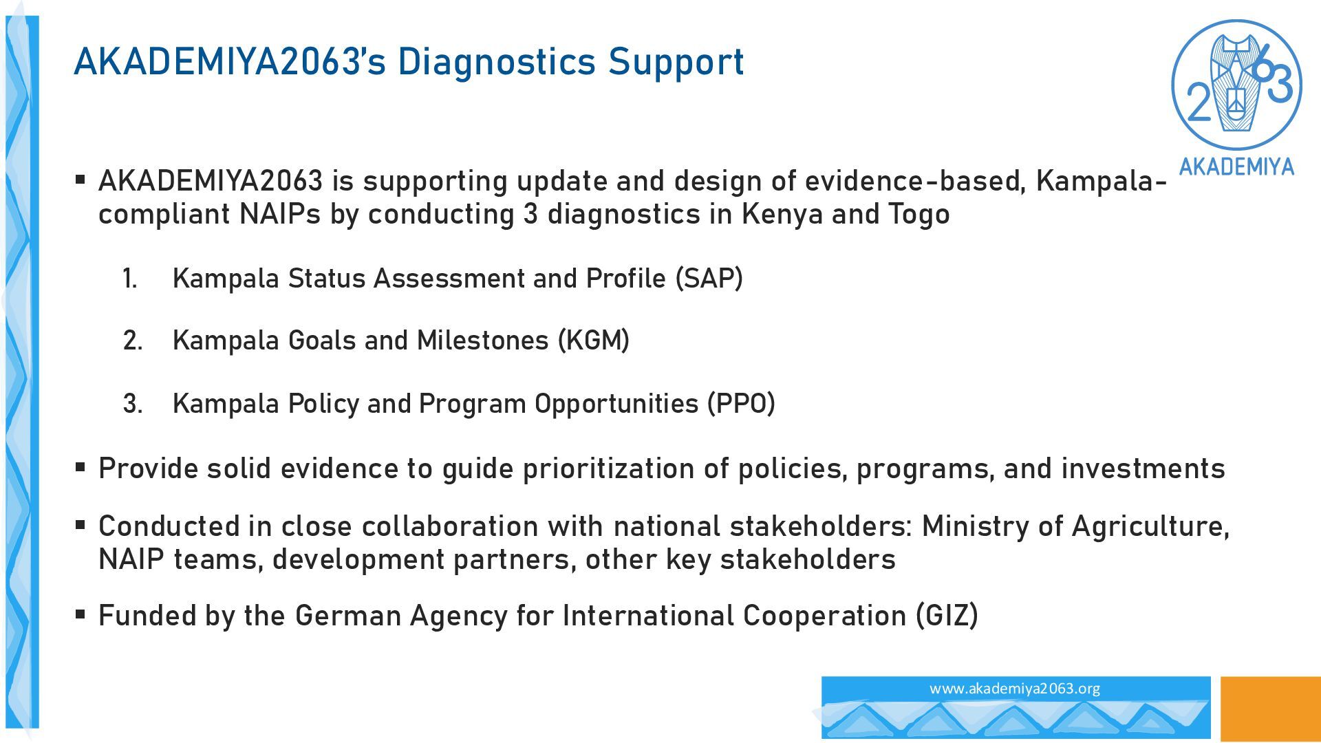 design of evidence-based, Kampala- compliant NAIPs by conducting 3 diagnostics in Kenya and Togo 1. Kampala Status Assessment and Profile (SAP) 2. Kampala Goals and Milestones (KGM) 3. Kampala Policy and Program Opportunities (PPO) ▪ Provide solid evidence to guide prioritization of policies, programs, and investments ▪ Conducted in close collaboration with national stakeholders: Ministry of Agriculture, NAIP teams, development partners, other key stakeholders ▪ Funded by the German Agency for International Cooperation (GIZ)