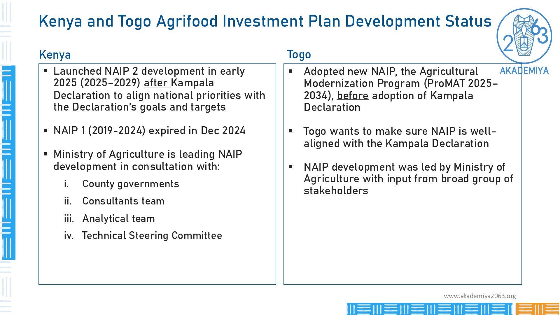 Togo ▪ Launched NAIP 2 development in early 2025 (2025–2029) after Kampala Declaration to align national priorities with the Declaration’s goals and targets ▪ NAIP 1 (2019-2024) expired in Dec 2024 ▪ Ministry of Agriculture is leading NAIP development in consultation with: i. County governments ii. Consultants team iii. Analytical team iv. Technical Steering Committee ▪ Adopted new NAIP, the Agricultural Modernization Program (ProMAT 2025– 2034), before adoption of Kampala Declaration ▪ Togo wants to make sure NAIP is well- aligned with the Kampala Declaration ▪ NAIP development was led by Ministry of Agriculture with input from broad group of stakeholders