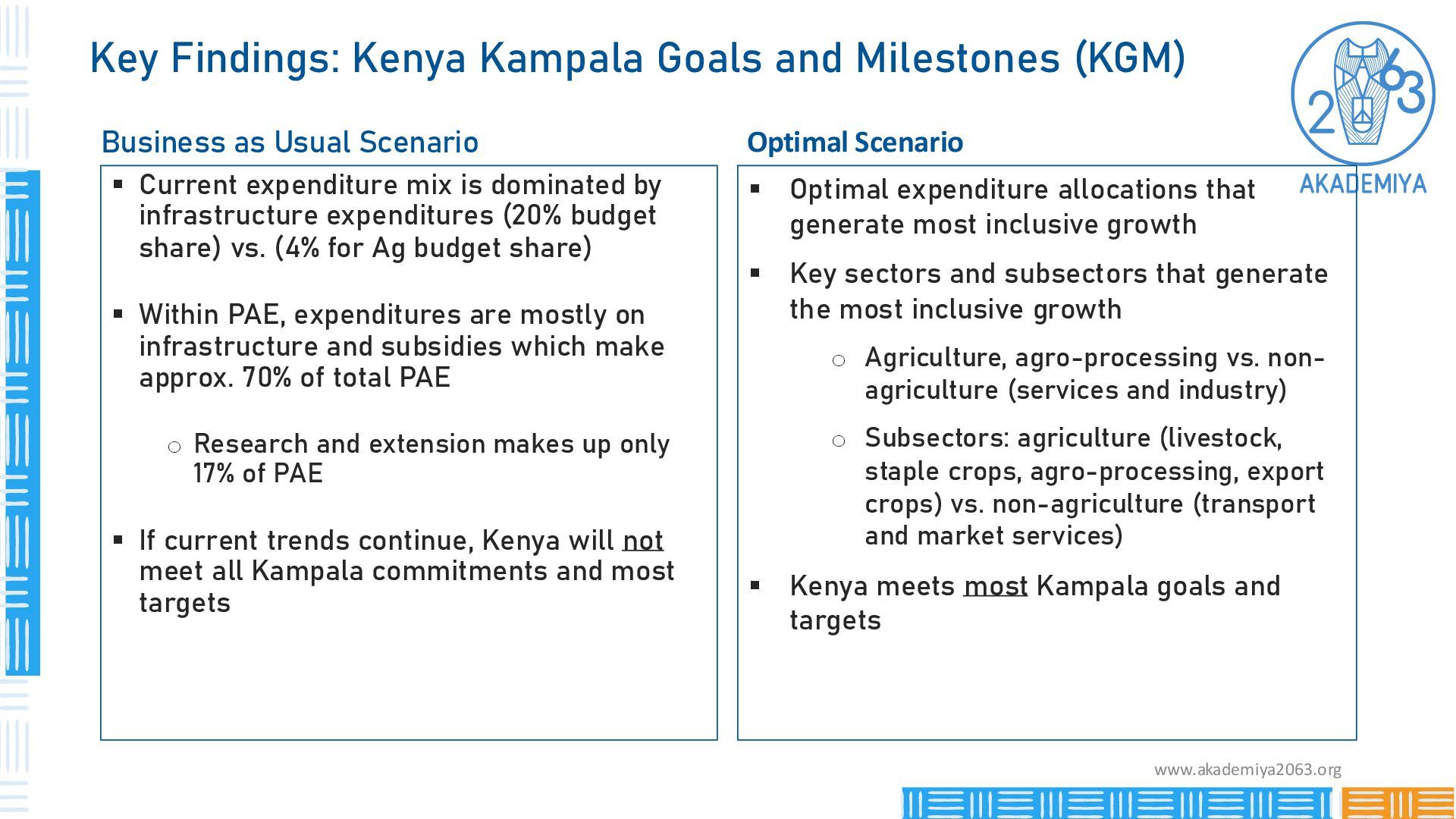 as Usual Scenario Optimal Scenario ▪ Current expenditure mix is dominated by infrastructure expenditures (20% budget share) vs. (4% for Ag budget share) ▪ Within PAE, expenditures are mostly on infrastructure and subsidies which make approx. 70% of total PAE o Research and extension makes up only 17% of PAE ▪ If current trends continue, Kenya will not meet all Kampala commitments and most targets ▪ Optimal expenditure allocations that generate most inclusive growth ▪ Key sectors and subsectors that generate the most inclusive growth o Agriculture, agro-processing vs. non- agriculture (services and industry) o Subsectors: agriculture (livestock, staple crops, agro-processing, export crops) vs. non-agriculture (transport and market services) ▪ Kenya meets most Kampala goals and targets