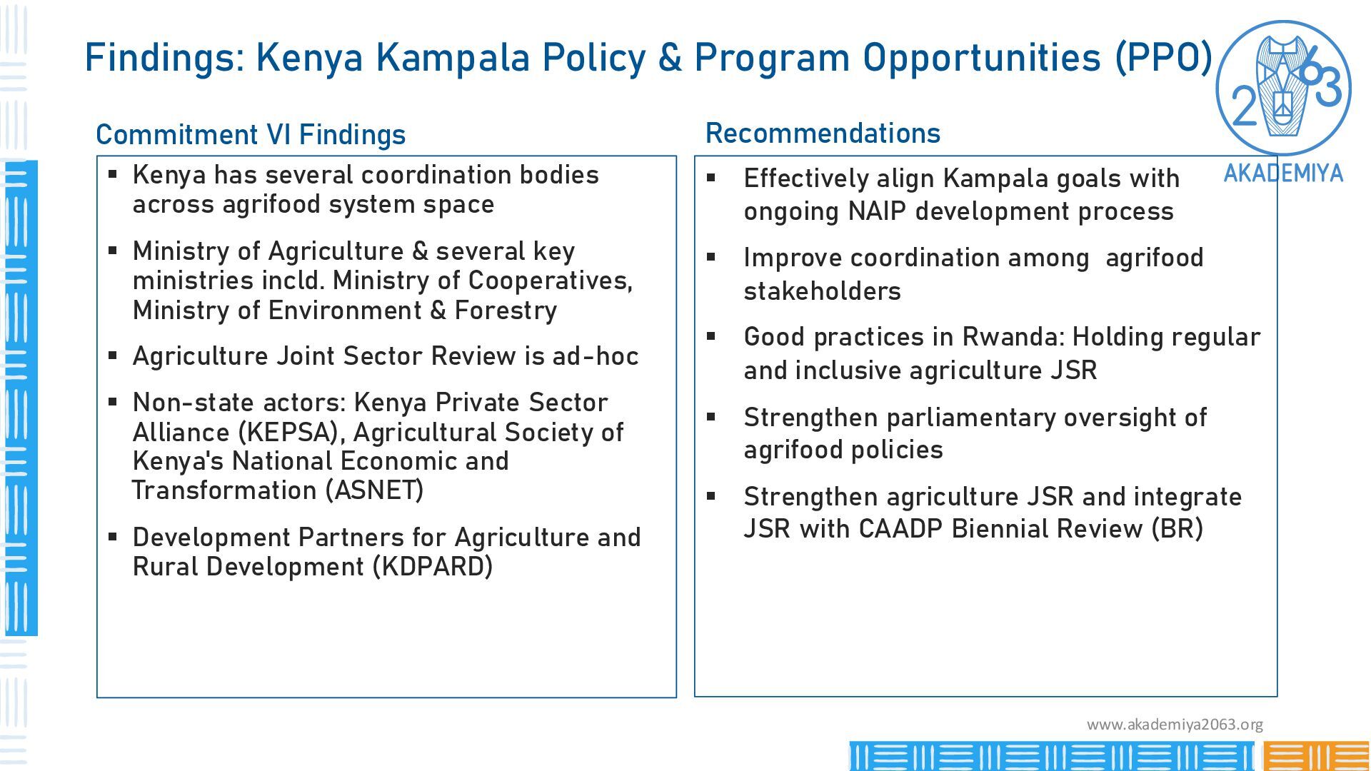 VI Findings Recommendations ▪ Kenya has several coordination bodies across agrifood system space ▪ Ministry of Agriculture & several key ministries incld. Ministry of Cooperatives, Ministry of Environment & Forestry ▪ Agriculture Joint Sector Review is ad-hoc ▪ Non-state actors: Kenya Private Sector Alliance (KEPSA), Agricultural Society of Kenya's National Economic and Transformation (ASNET) ▪ Development Partners for Agriculture and Rural Development (KDPARD) ▪ Effectively align Kampala goals with ongoing NAIP development process ▪ Improve coordination among agrifood stakeholders ▪ Good practices in Rwanda: Holding regular and inclusive agriculture JSR ▪ Strengthen parliamentary oversight of agrifood policies ▪ Strengthen agriculture JSR and integrate JSR with CAADP Biennial Review (BR)