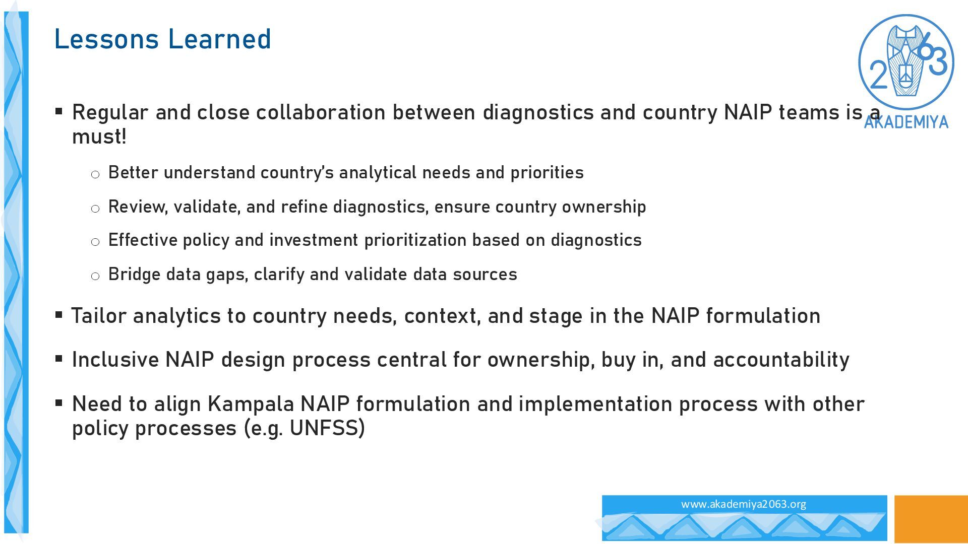 and country NAIP teams is a must! o Better understand country’s analytical needs and priorities o Review, validate, and refine diagnostics, ensure country ownership o Effective policy and investment prioritization based on diagnostics o Bridge data gaps, clarify and validate data sources ▪ Tailor analytics to country needs, context, and stage in the NAIP formulation ▪ Inclusive NAIP design process central for ownership, buy in, and accountability ▪ Need to align Kampala NAIP formulation and implementation process with other policy processes (e.g. UNFSS)