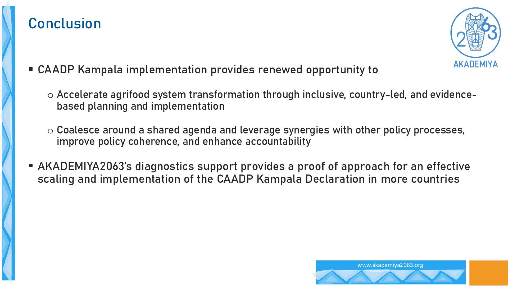o Accelerate agrifood system transformation through inclusive, country-led, and evidence- based planning and implementation o Coalesce around a shared agenda and leverage synergies with other policy processes, improve policy coherence, and enhance accountability ▪ AKADEMIYA2063’s diagnostics support provides a proof of approach for an effective scaling and implementation of the CAADP Kampala Declaration in more countries