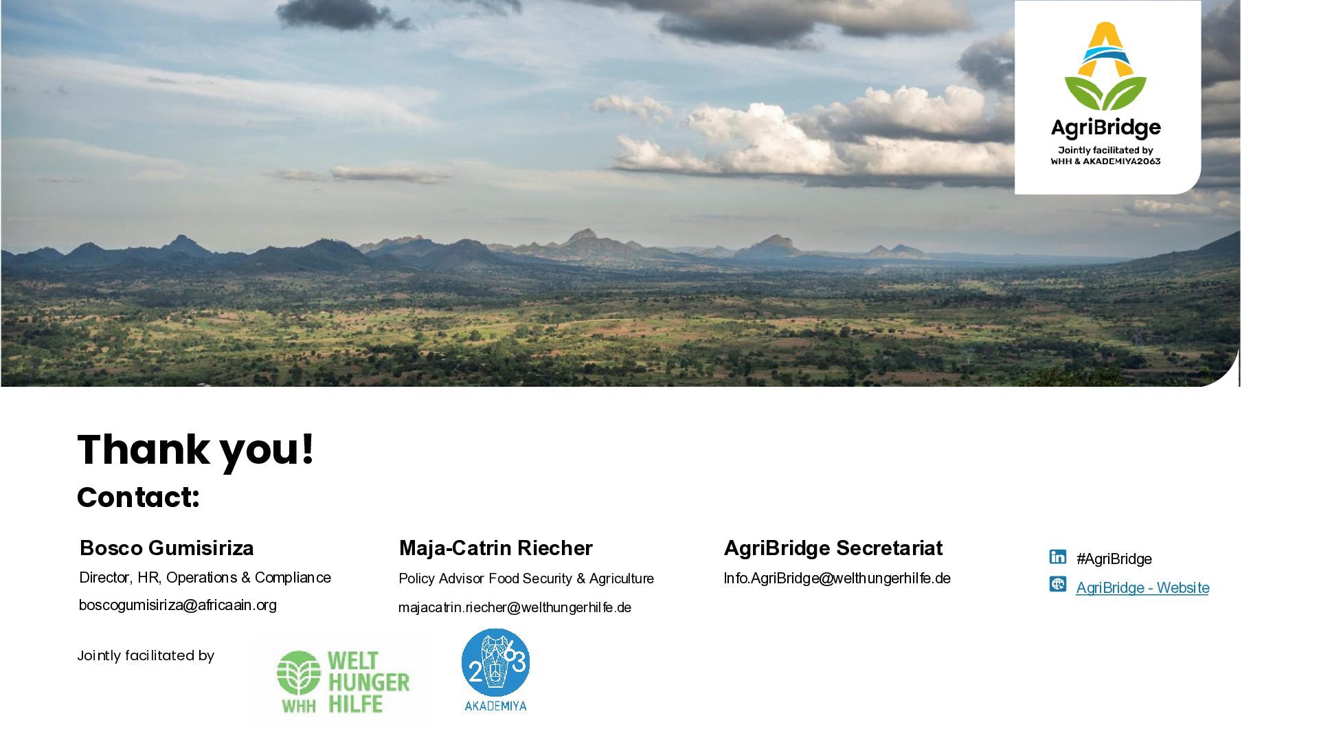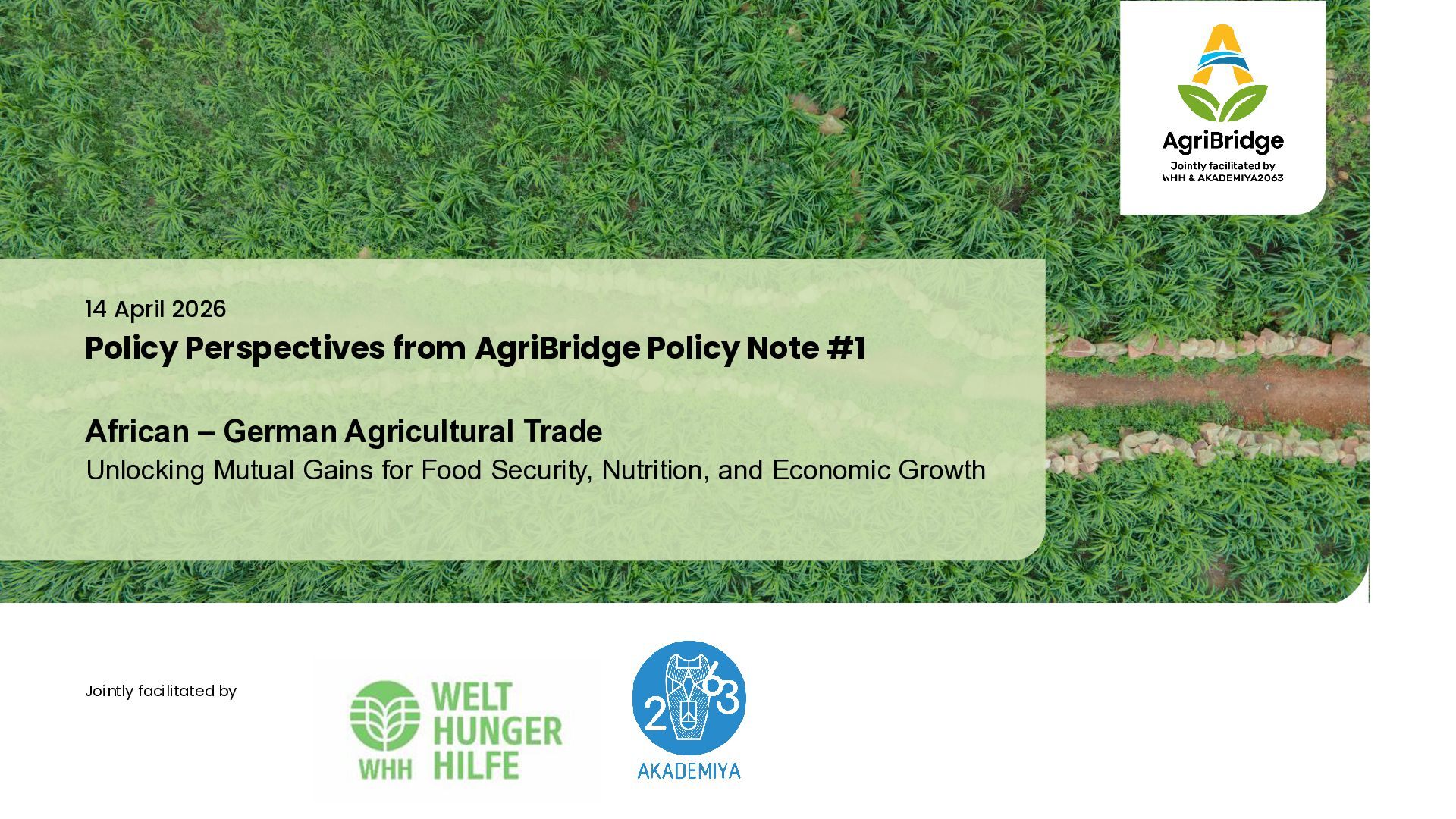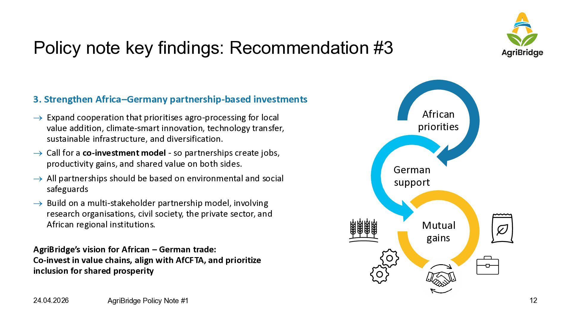 investments → Expand cooperation that prioritises agro-processing for local value addition, climate-smart innovation, technology transfer, sustainable infrastructure, and diversification. → Call for a co-investment model - so partnerships create jobs, productivity gains, and shared value on both sides. → All partnerships should be based on environmental and social safeguards → Build on a multi-stakeholder partnership model, involving research organisations, civil society, the private sector, and African regional institutions. AgriBridge’s vision for African – German trade: Co-invest in value chains, align with AfCFTA, and prioritize inclusion for shared prosperity 24.04.2026 AgriBridge Policy Note #1 12 African priorities German support Mutual gains
