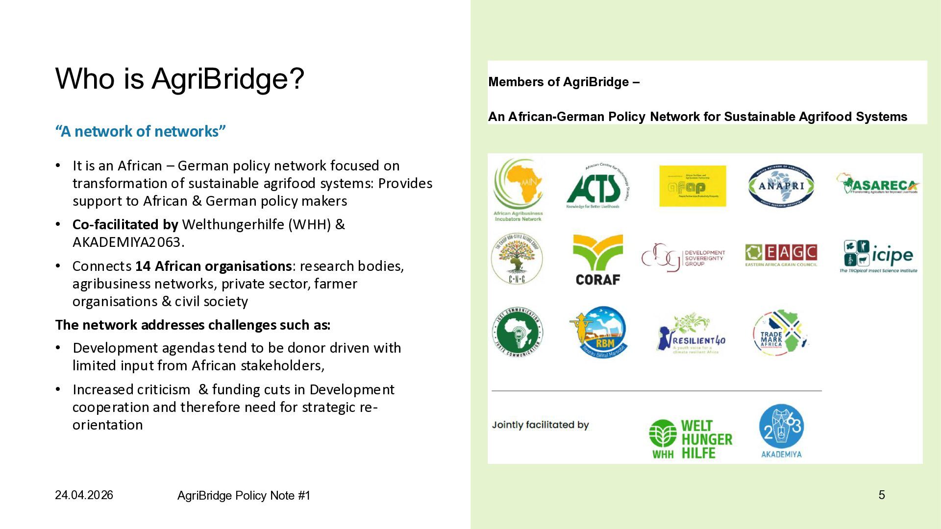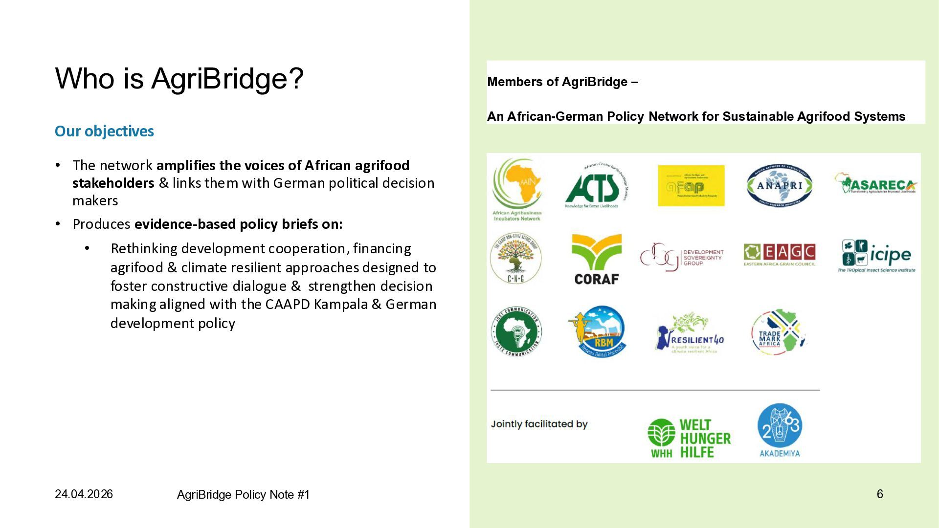 an African – German policy network focused on transformation of sustainable agrifood systems: Provides support to African & German policy makers • Co-facilitated by Welthungerhilfe (WHH) & AKADEMIYA2063. • Connects 14 African organisations: research bodies, agribusiness networks, private sector, farmer organisations & civil society The network addresses challenges such as: • Development agendas tend to be donor driven with limited input from African stakeholders, • Increased criticism & funding cuts in Development cooperation and therefore need for strategic re- orientation 24.04.2026 AgriBridge Policy Note #1 5 Members of AgriBridge – An African-German Policy Network for Sustainable Agrifood Systems
