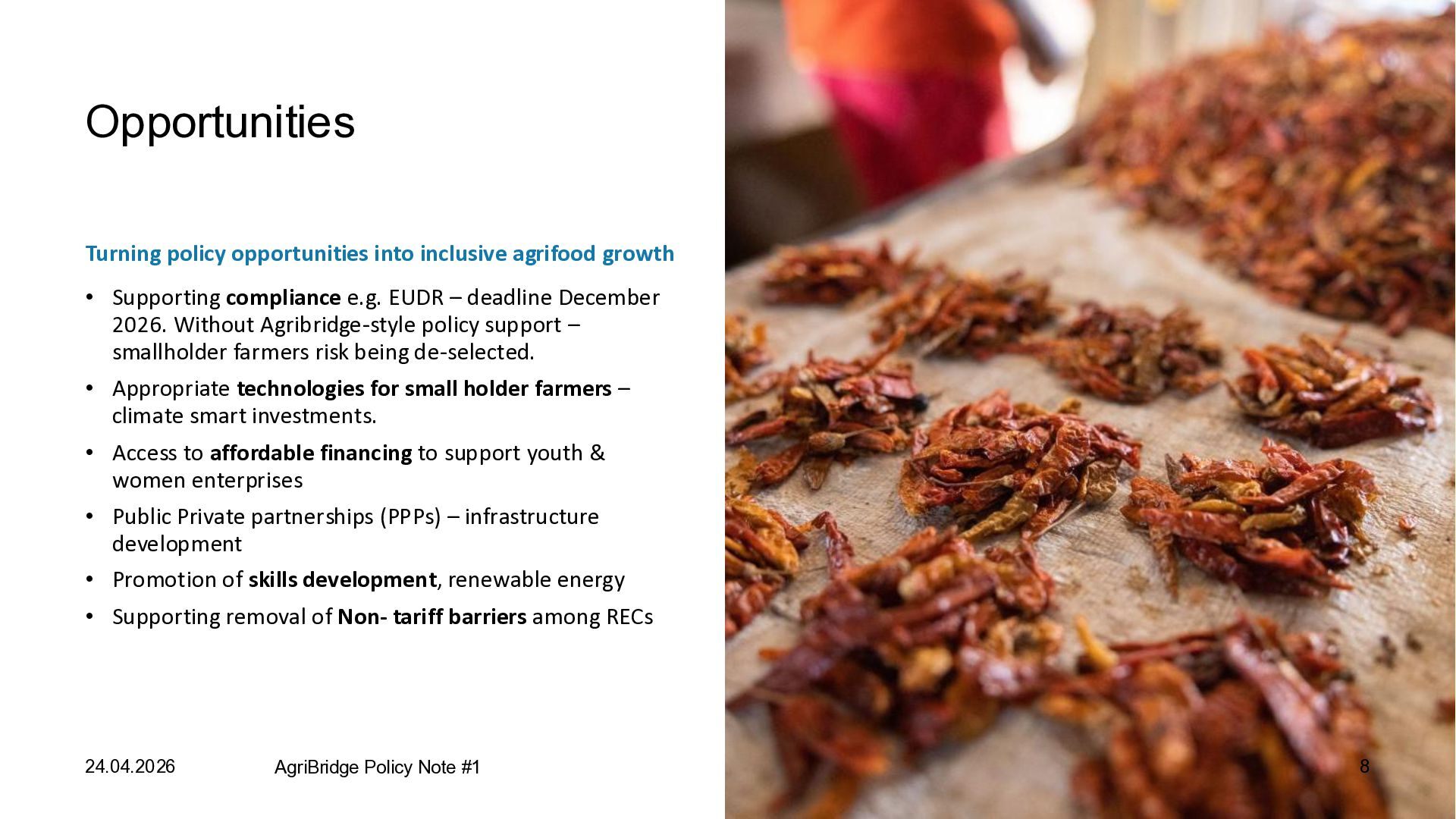 compliance e.g. EUDR – deadline December 2026. Without Agribridge-style policy support – smallholder farmers risk being de-selected. • Appropriate technologies for small holder farmers – climate smart investments. • Access to affordable financing to support youth & women enterprises • Public Private partnerships (PPPs) – infrastructure development • Promotion of skills development, renewable energy • Supporting removal of Non- tariff barriers among RECs 24.04.2026 AgriBridge Policy Note #1 8