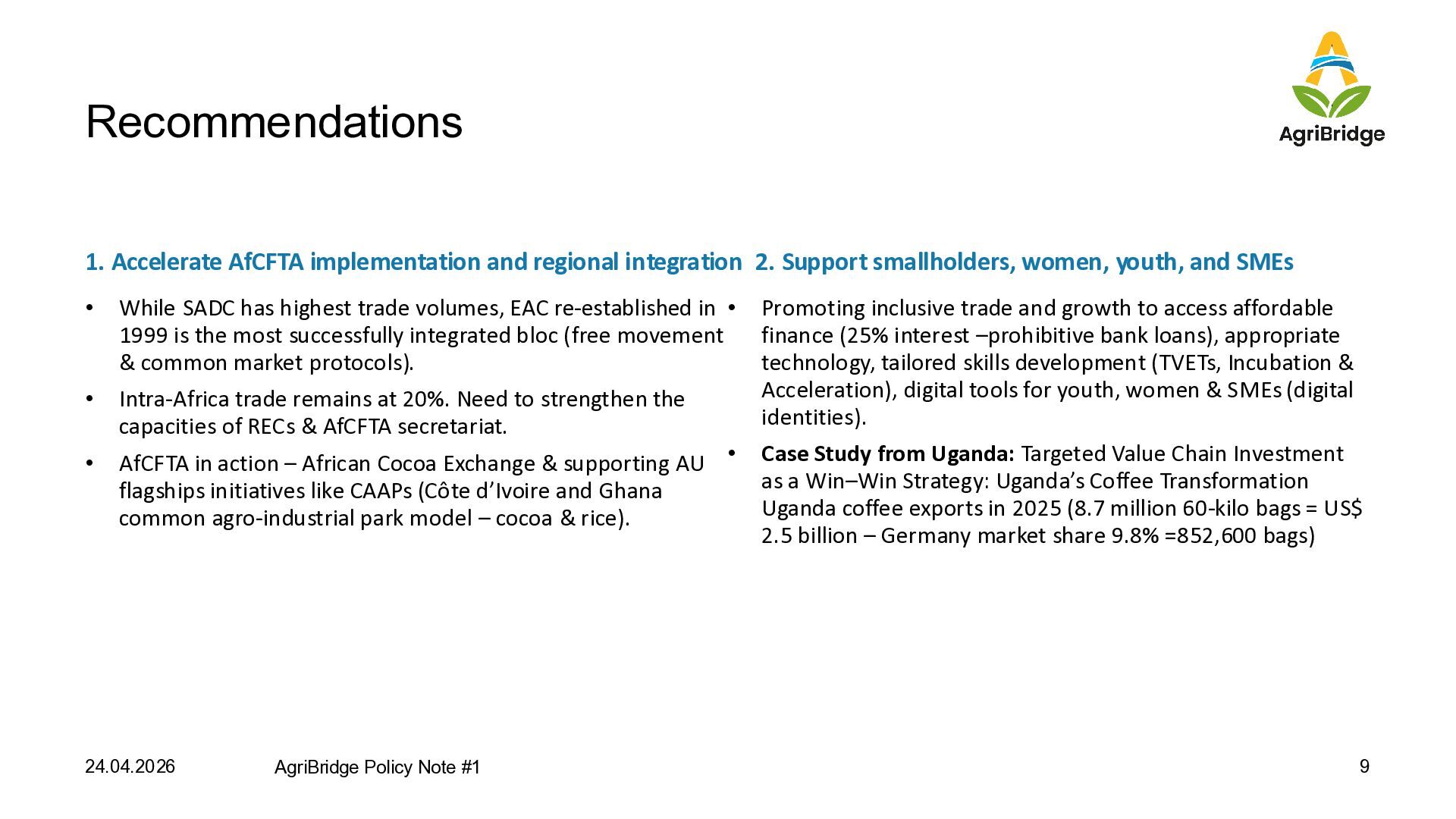 SADC has highest trade volumes, EAC re-established in 1999 is the most successfully integrated bloc (free movement & common market protocols). • Intra-Africa trade remains at 20%. Need to strengthen the capacities of RECs & AfCFTA secretariat. • AfCFTA in action – African Cocoa Exchange & supporting AU flagships initiatives like CAAPs (Côte d’Ivoire and Ghana common agro-industrial park model – cocoa & rice). • Promoting inclusive trade and growth to access affordable finance (25% interest –prohibitive bank loans), appropriate technology, tailored skills development (TVETs, Incubation & Acceleration), digital tools for youth, women & SMEs (digital identities). • Case Study from Uganda: Targeted Value Chain Investment as a Win–Win Strategy: Uganda’s Coffee Transformation Uganda coffee exports in 2025 (8.7 million 60-kilo bags = US$ 2.5 billion – Germany market share 9.8% =852,600 bags) 24.04.2026 AgriBridge Policy Note #1 9 2. Support smallholders, women, youth, and SMEs