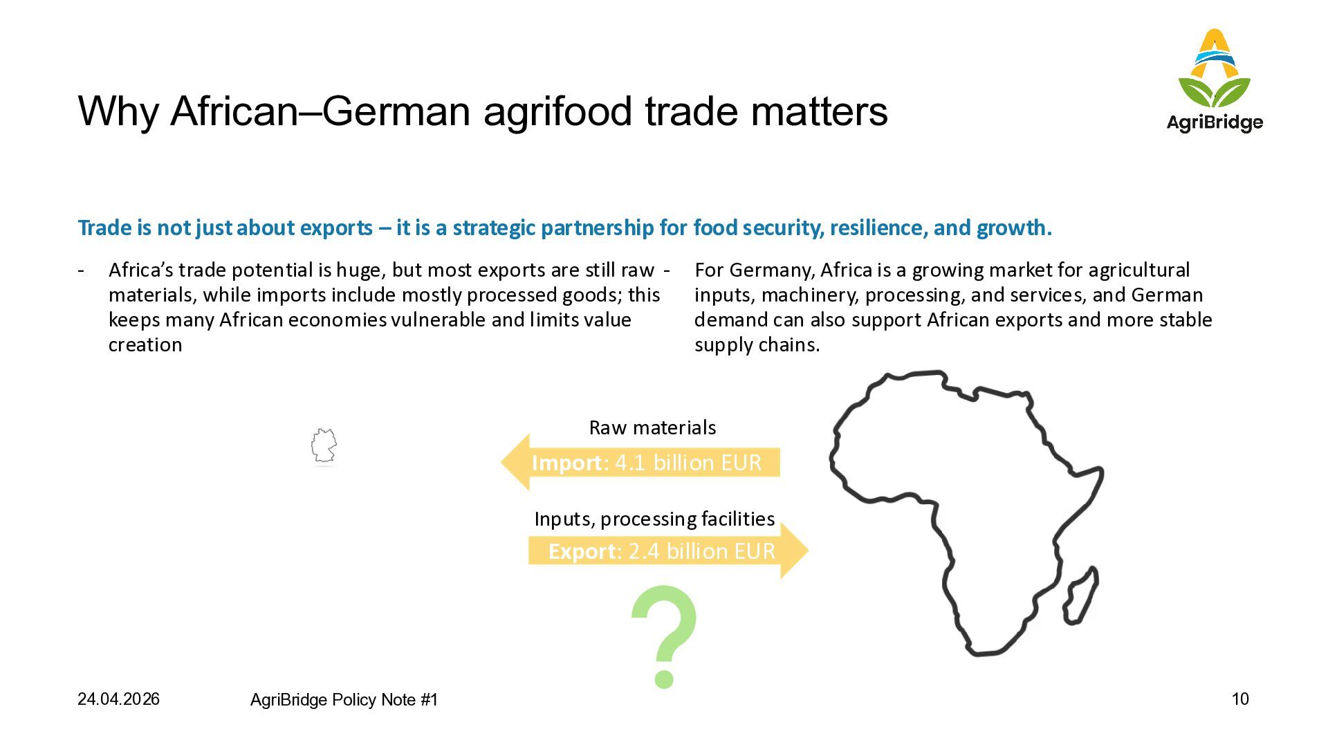 exports – it is a strategic partnership for food security, resilience, and growth. - Africa’s trade potential is huge, but most exports are still raw materials, while imports include mostly processed goods; this keeps many African economies vulnerable and limits value creation - For Germany, Africa is a growing market for agricultural inputs, machinery, processing, and services, and German demand can also support African exports and more stable supply chains. 24.04.2026 AgriBridge Policy Note #1 10 Export: 2.4 billion EUR Import: 4.1 billion EUR Raw materials Inputs, processing facilities