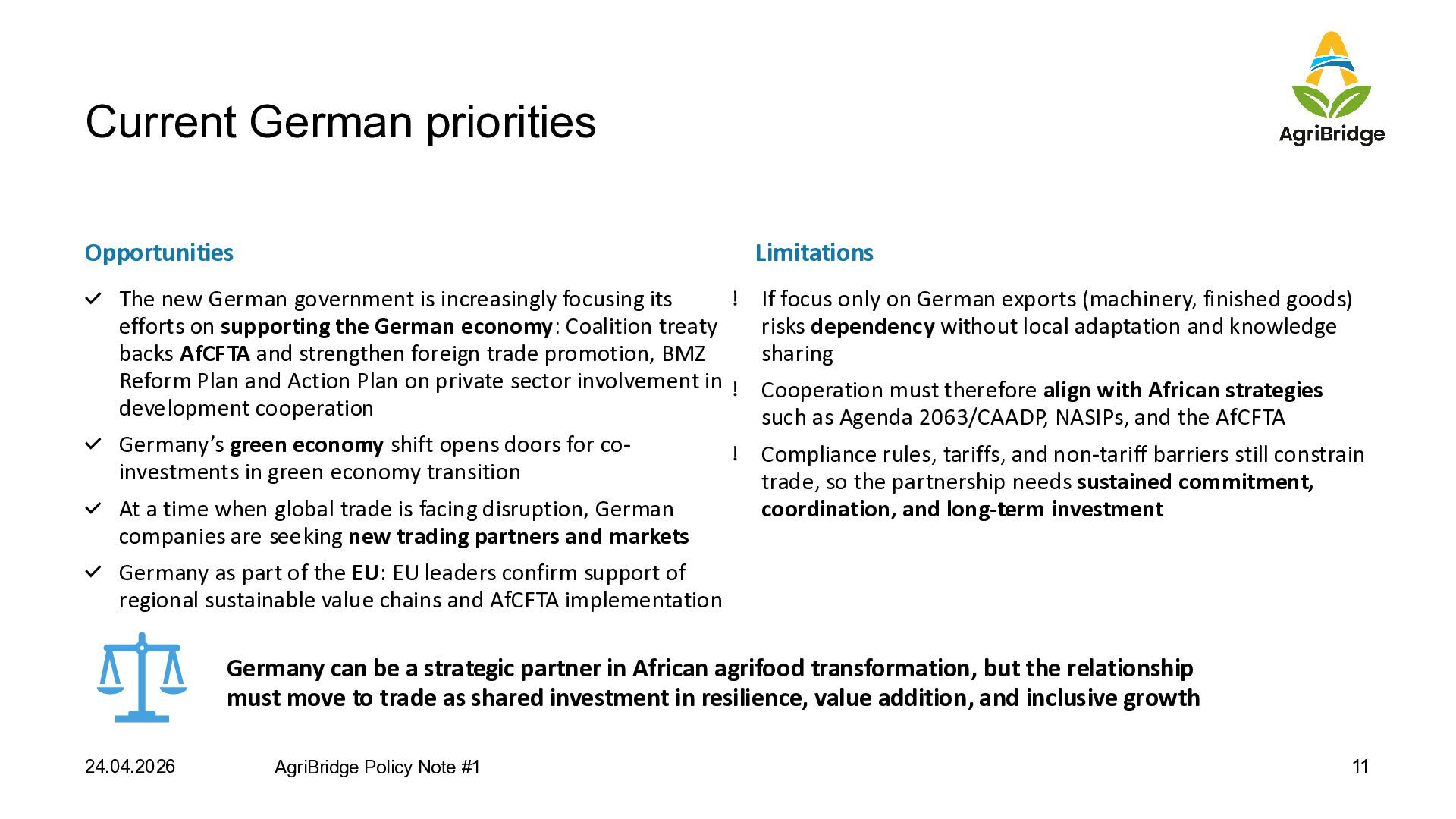focusing its efforts on supporting the German economy: Coalition treaty backs AfCFTA and strengthen foreign trade promotion, BMZ Reform Plan and Action Plan on private sector involvement in development cooperation Germany’s green economy shift opens doors for co- investments in green economy transition At a time when global trade is facing disruption, German companies are seeking new trading partners and markets Germany as part of the EU: EU leaders confirm support of regional sustainable value chains and AfCFTA implementation If focus only on German exports (machinery, finished goods) risks dependency without local adaptation and knowledge sharing Cooperation must therefore align with African strategies such as Agenda 2063/CAADP, NASIPs, and the AfCFTA Compliance rules, tariffs, and non-tariff barriers still constrain trade, so the partnership needs sustained commitment, coordination, and long-term investment 24.04.2026 AgriBridge Policy Note #1 11 Limitations Germany can be a strategic partner in African agrifood transformation, but the relationship must move to trade as shared investment in resilience, value addition, and inclusive growth