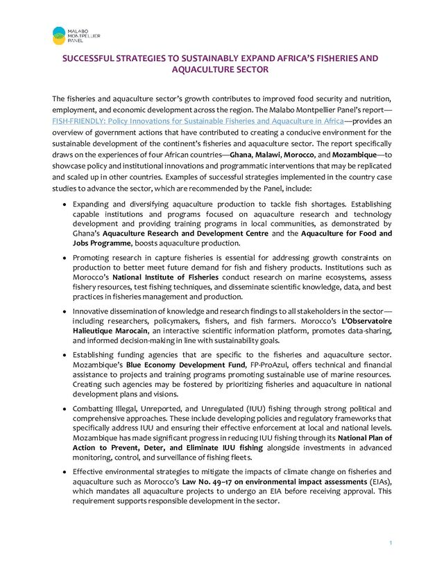 The fisheries and aquaculture sector’s growth contributes to improved food security and nutrition, employment, and economic development across the region. The Malabo Montpellier Panel’s report—FISH-FRIENDLY: Policy Innovations for Sustainable Fisheries and Aquaculture in Africa—provides an overview of government actions that have contributed to creating a conducive environment for the sustainable development of the continent’s fisheries and aquaculture sector. The report specifically draws on the experiences of four African countries—Ghana, Malawi, Morocco, and Mozambique—to showcase policy and institutional innovations and programmatic interventions that may be replicated and scaled up in other countries.