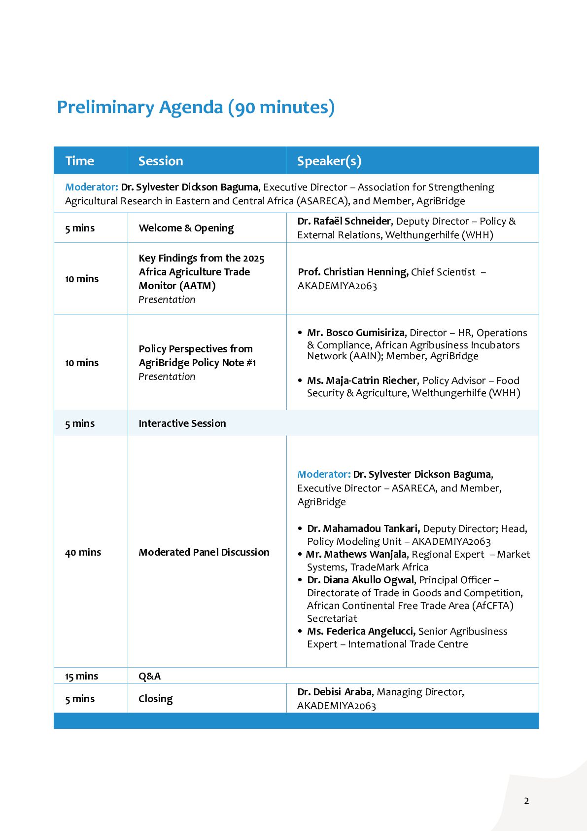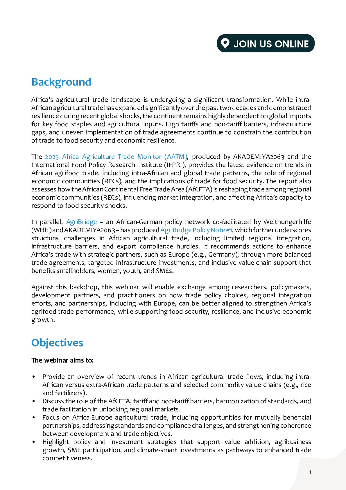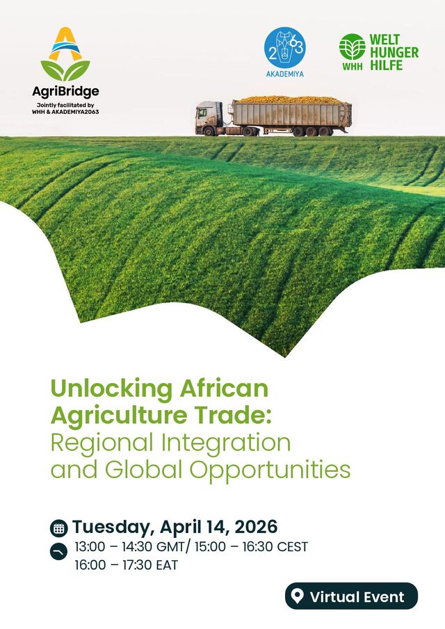While intra- African agricultural trade has expanded significantly over the past two decades and demonstrated resilience during recent global shocks, the continent remains highly dependent on global imports for key food staples and agricultural inputs. High tariffs and non-tariff barriers, infrastructure gaps, and uneven implementation of trade agreements continue to constrain the contribution of trade to food security and economic resilience. The 2025 Africa Agriculture Trade Monitor (AATM), produced by AKADEMIYA2063 and the International Food Policy Research Institute (IFPRI), provides the latest evidence on trends in African agrifood trade, including intra-African and global trade patterns, the role of regional economic communities (RECs), and the implications of trade for food security. The report also assesses how the African Continental Free Trade Area (AfCFTA) is reshaping trade among regional economic communities (RECs), influencing market integration, and affecting Africa’s capacity to respond to food security shocks. In parallel, AgriBridge – an African-German policy network co-facilitated by Welthungerhilfe (WHH) and AKADEMIYA2063 – has produced AgriBridge Policy Note #1, which further underscores structural challenges in African agricultural trade, including limited regional integration, infrastructure barriers, and export compliance hurdles. It recommends actions to enhance Africa’s trade with strategic partners, such as Europe (e.g., Germany), through more balanced trade agreements, targeted infrastructure investments, and inclusive value-chain support that benefits smallholders, women, youth, and SMEs. Against this backdrop, this webinar will enable exchange among researchers, policymakers, development partners, and practitioners on how trade policy choices, regional integration efforts, and partnerships, including with Europe, can be better aligned to strengthen Africa’s agrifood trade performance, while supporting food security, resilience, and inclusive economic growth. Objectives The webinar aims to: • Provide an overview of recent trends in African agricultural trade flows, including intra- African versus extra-African trade patterns and selected commodity value chains (e.g., rice and fertilizers). • Discuss the role of the AfCFTA, tariff and non-tariff barriers, harmonization of standards, and trade facilitation in unlocking regional markets. • Focus on Africa-Europe agricultural trade, including opportunities for mutually beneficial partnerships, addressing standards and compliance challenges, and strengthening coherence between development and trade objectives. • Highlight policy and investment strategies that support value addition, agribusiness growth, SME participation, and climate-smart investments as pathways to enhanced trade competitiveness. JOIN US ONLINE 1