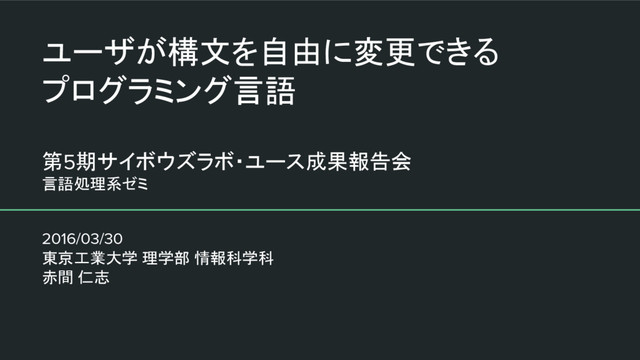ユーザが構文を自由に変更できる プログラミング言語 第5期サイボウズラボ・ユース成果報告会 言語処理系ゼミ 2016/03/30 東京工業大学 理学部 情報科学科 赤間 仁志