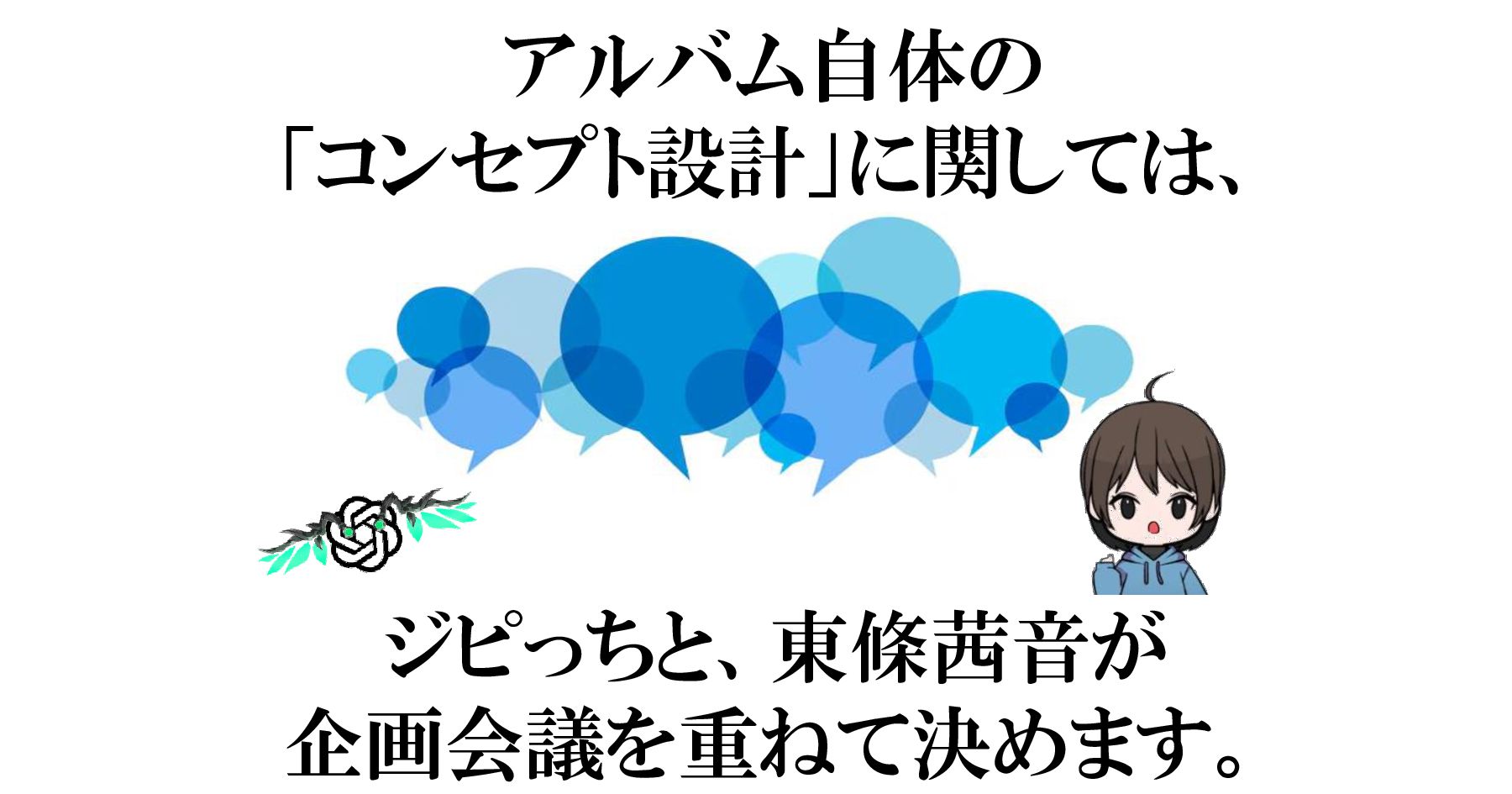 アルバム自体の 「コンセプト設計」に関しては、 ジピっちと、東條茜音が 企画会議を重ねて決めます。