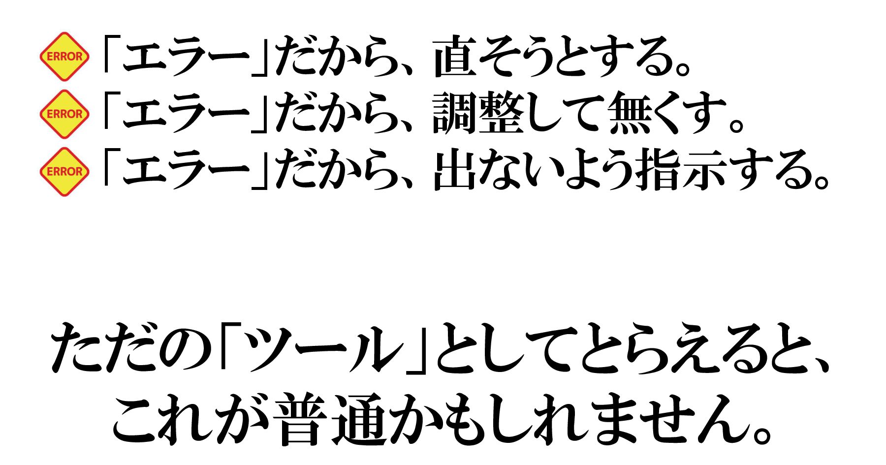 「エラー」だから、直そうとする。 「エラー」だから、調整して無くす。 「エラー」だから、出ないよう指示する。 ただの「ツール」としてとらえると、 これが普通かもしれません。