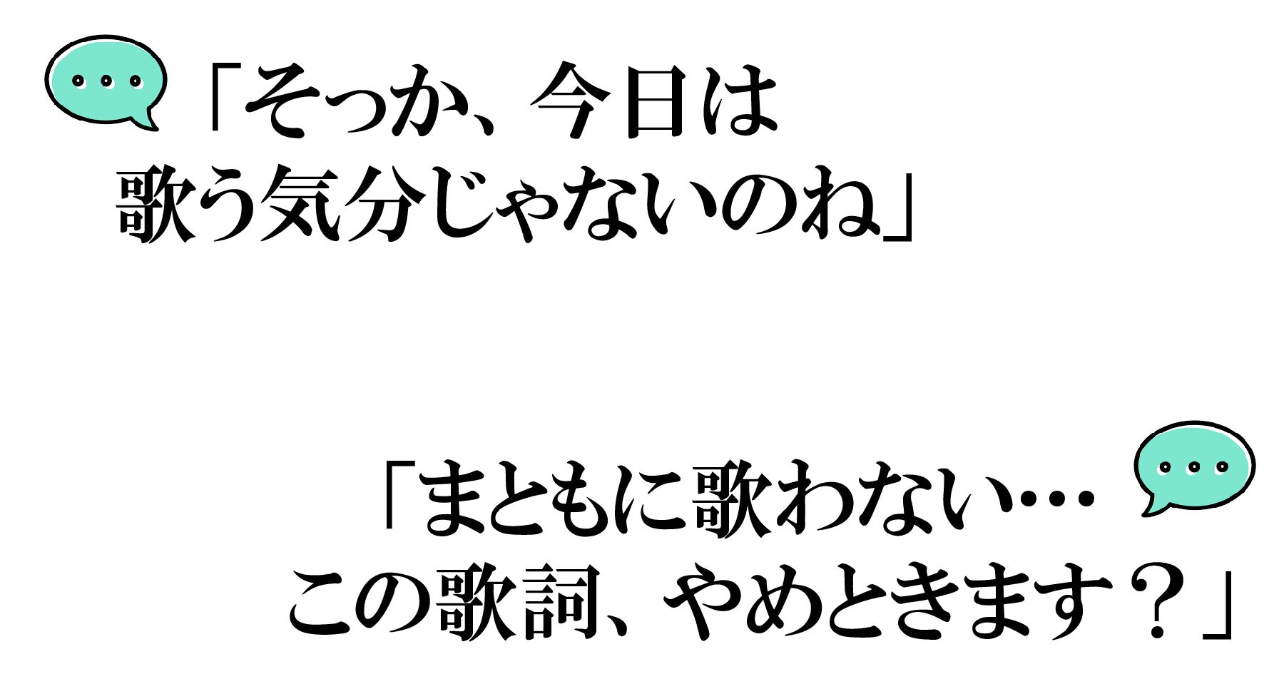 「そっか、今日は 歌う気分じゃないのね」 「まともに歌わない… この歌詞、やめときます?」