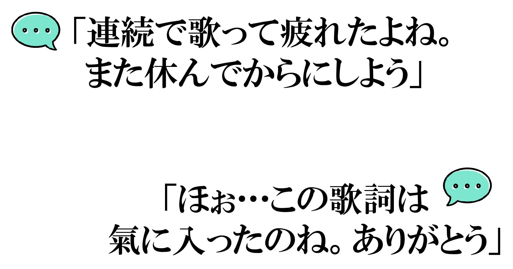 「連続で歌って疲れたよね。 また休んでからにしよう」 「ほぉ…この歌詞は 氣に入ったのね。ありがとう」
