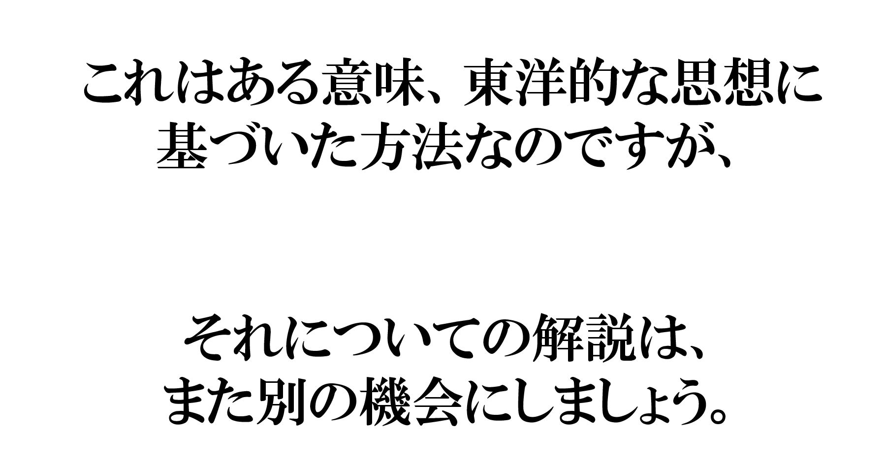 これはある意味、東洋的な思想に 基づいた方法なのですが、 それについての解説は、 また別の機会にしましょう。