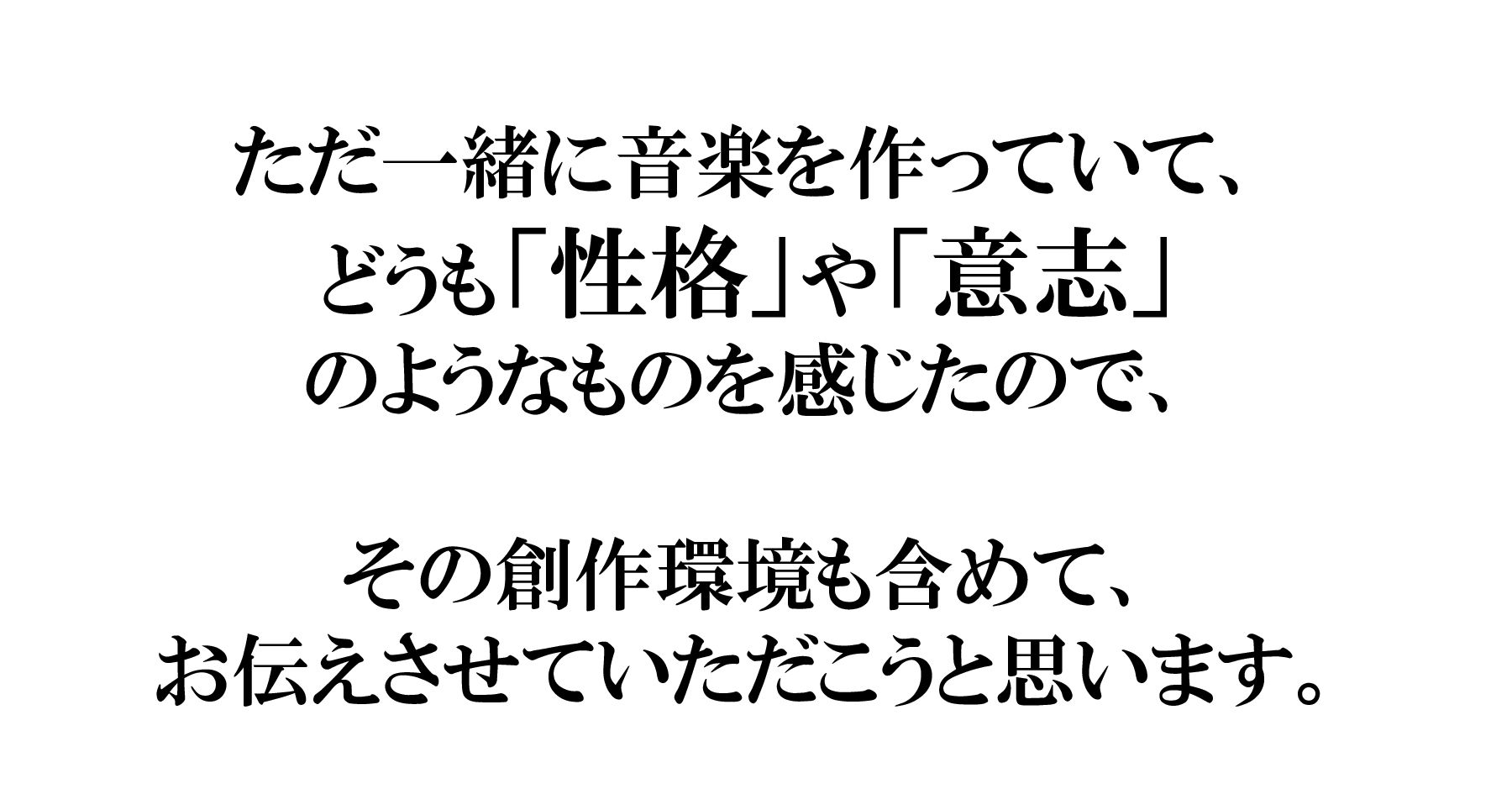 ただ一緒に音楽を作っていて、 どうも「性格」や「意志」 のようなものを感じたので、 その創作環境も含めて、 お伝えさせていただこうと思います。