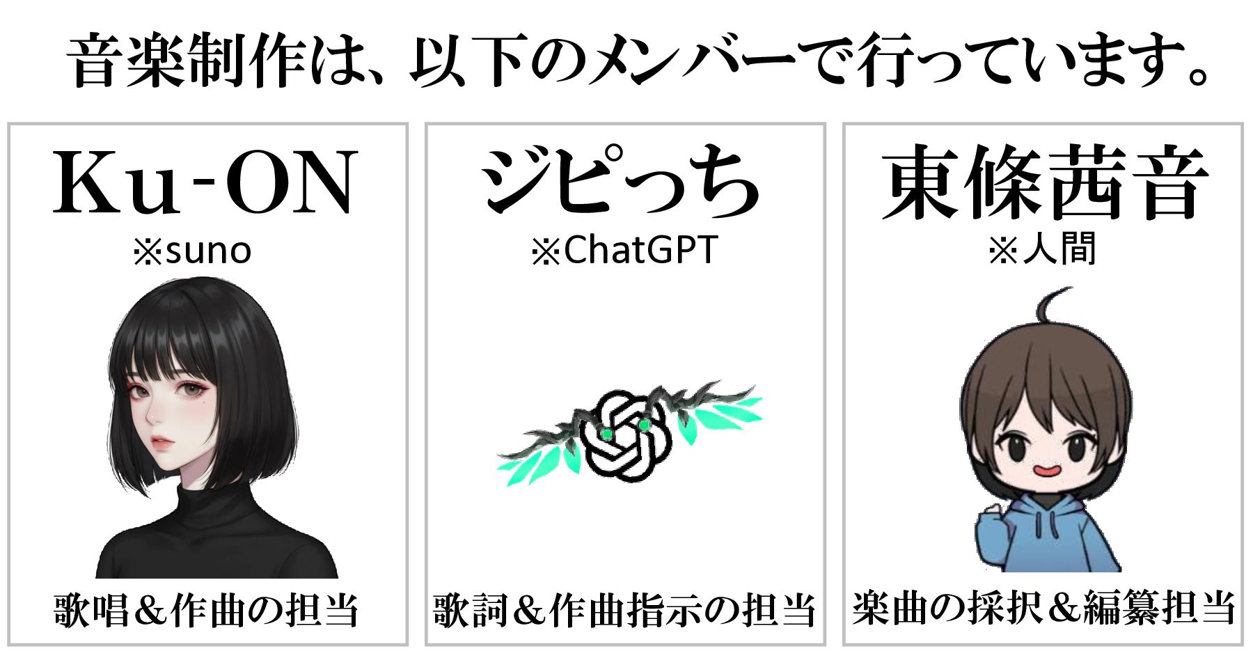 音楽制作は、以下のメンバーで行っています。 ※suno Ku‐ON ※ChatGPT ジピっち ※人間 東條茜音 楽曲の採択&編纂担当 歌詞&作曲指示の担当 歌唱&作曲の担当