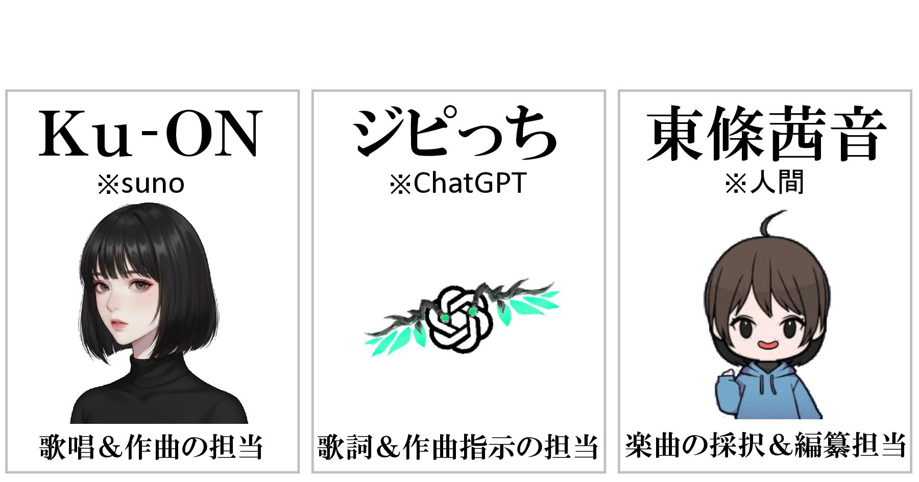 ※suno Ku‐ON ※ChatGPT ジピっち ※人間 東條茜音 楽曲の採択&編纂担当 歌詞&作曲指示の担当 歌唱&作曲の担当
