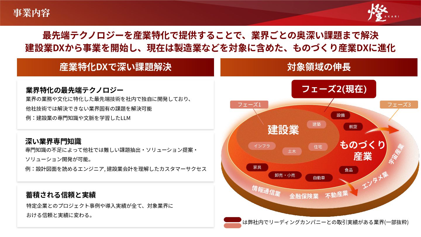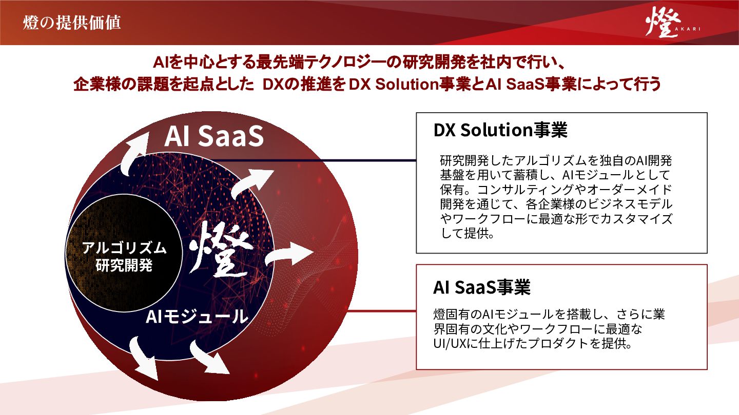 AI SaaS DX Solution事業 AI SaaS事業 研究開発したアルゴリズムを独⾃のAI開発 基盤を⽤いて蓄積し、AIモジュールとして 保有。コンサルティングやオーダーメイド 開発を通じて、各企業様のビジネスモデル やワークフローに最適な形でカスタマイズ して提供。 燈固有のAIモジュールを搭載し、さらに業 界固有の⽂化やワークフローに最適な UI/UXに仕上げたプロダクトを提供。