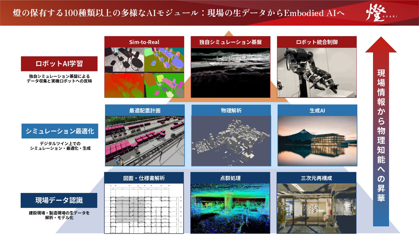 7. 燈の保有する100種類以上の多様なAIモジュール:現場の生データからEmbodied AIへ 図⾯‧仕様書解析 三次元再構成 点群処理 ⽣成AI 物理解析 最適配置計画 Sim-to-Real ロボット統合制御