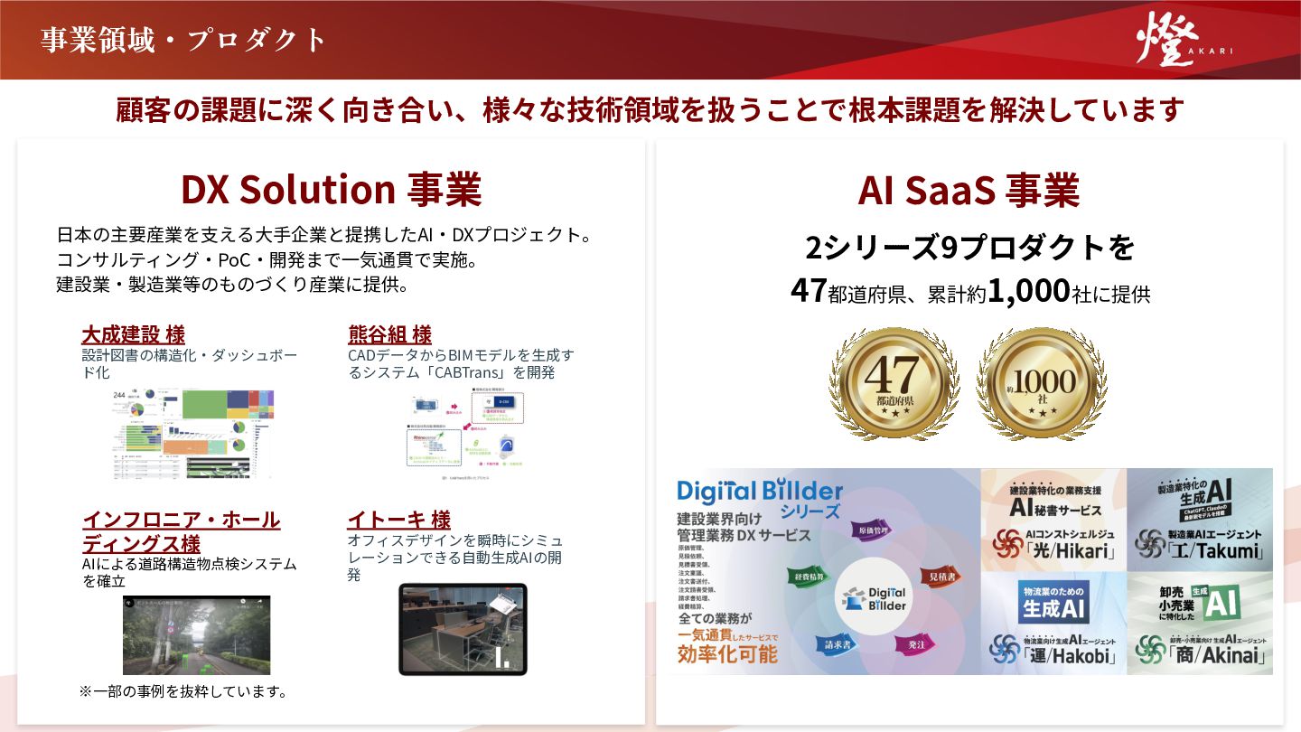 ⽇本の主要産業を⽀える⼤⼿企業と提携したAI‧DXプロジェクト。 コンサルティング‧PoC‧開発まで⼀気通貫で実施。 建設業‧製造業等のものづくり産業に提供。 インフロニア‧ホール ディングス様 AIによる道路構造物点検システム を確⽴ イトーキ 様 オフィスデザインを瞬時にシミュ レーションできる⾃動⽣成AIの開 発 ⼤成建設 様 設計図書の構造化‧ダッシュボー ド化 熊⾕組 様 CADデータからBIMモデルを⽣成す るシステム「CABTrans」を開発 ※⼀部の事例を抜粋しています。