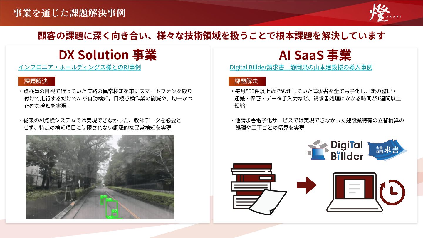 付けて⾛⾏するだけでAIが⾃動検知。⽬視点検作業の削減や、均⼀かつ 正確な検知を実現。 ‧従来のAI点検システムでは実現できなかった、教師データを必要と  せず、特定の検知項⽬に制限されない網羅的な異常検知を実現 Digital Billder請求書 静岡県の⼭本建設様の導⼊事例 ‧毎⽉500件以上紙で処理していた請求書を全て電⼦化し、紙の整理‧ 運搬‧保管‧データ⼿⼊⼒など、請求書処理にかかる時間が1週間以上 短縮 ‧他請求書電⼦化サービスでは実現できなかった建設業特有の⽴替精算の 処理や⼯事ごとの精算を実現 課題解決 課題解決