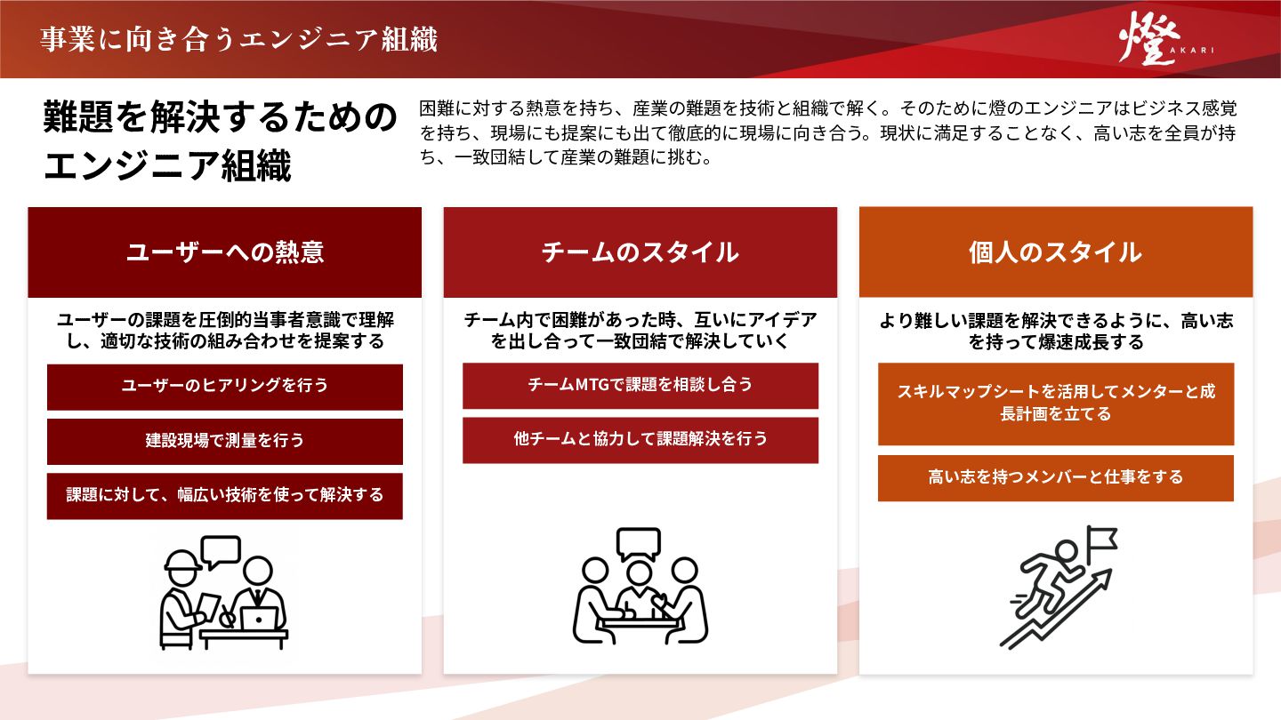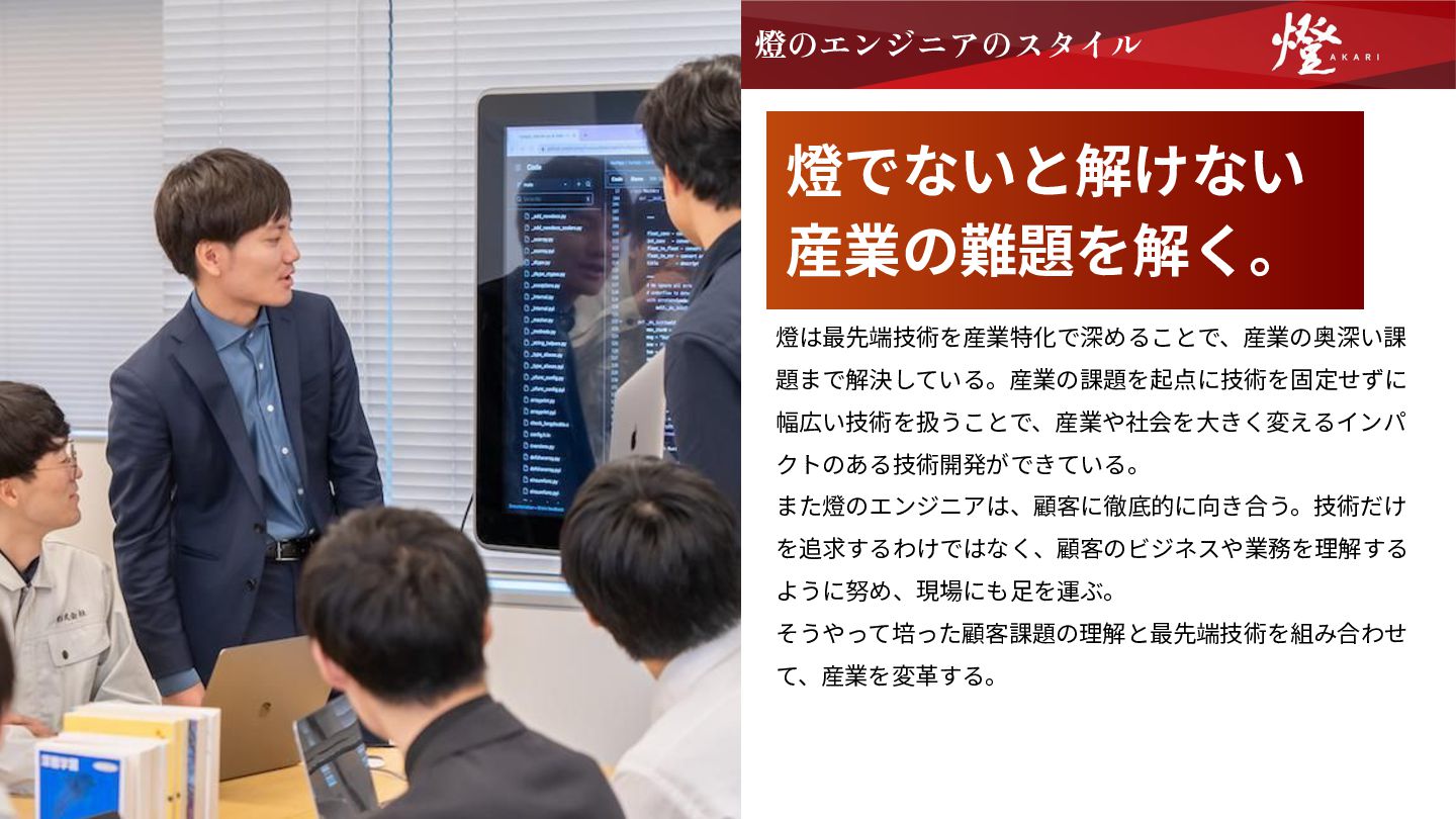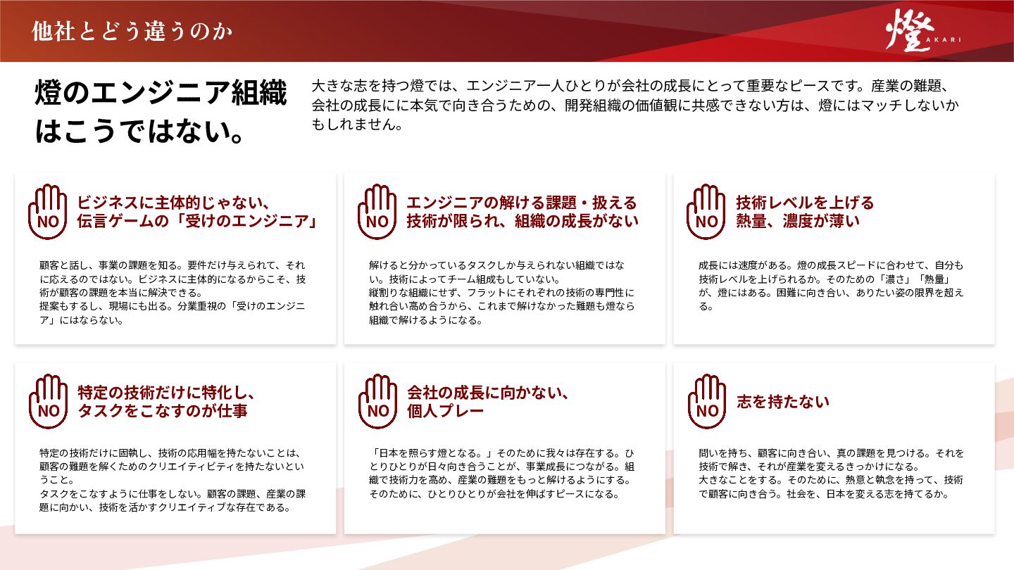 ⼤きな志を持つ燈では、エンジニア⼀⼈ひとりが会社の成⻑にとって重要なピースです。産業の難題、 会社の成⻑にに本気で向き合うための、開発組織の価値観に共感できない⽅は、燈にはマッチしないか もしれません。 他社とどう違うのか ビジネスに主体的じゃない、 伝⾔ゲームの「受けのエンジニア」 顧客と話し、事業の課題を知る。要件だけ与えられて、それ に応えるのではない。ビジネスに主体的になるからこそ、技 術が顧客の課題を本当に解決できる。 提案もするし、現場にも出る。分業重視の「受けのエンジニ ア」にはならない。 NO 会社の成⻑に向かない、 個⼈プレー 「⽇本を照らす燈となる。」そのために我々は存在する。ひ とりひとりが⽇々向き合うことが、事業成⻑につながる。組 織で技術⼒を⾼め、産業の難題をもっと解けるようにする。 そのために、ひとりひとりが会社を伸ばすピースになる。 NO エンジニアの解ける課題‧扱える 技術が限られ、組織の成⻑がない 解けると分かっているタスクしか与えられない組織ではな い。技術によってチーム組成もしていない。 縦割りな組織にせず、フラットにそれぞれの技術の専⾨性に 触れ合い⾼め合うから、これまで解けなかった難題も燈なら 組織で解けるようになる。 NO 志を持たない 問いを持ち、顧客に向き合い、真の課題を⾒つける。それを 技術で解き、それが産業を変えるきっかけになる。 ⼤きなことをする。そのために、熱意と執念を持って、技術 で顧客に向き合う。社会を、⽇本を変える志を持てるか。 NO 技術レベルを上げる 熱量、濃度が薄い 成⻑には速度がある。燈の成⻑スピードに合わせて、⾃分も 技術レベルを上げられるか。そのための「濃さ」「熱量」 が、燈にはある。困難に向き合い、ありたい姿の限界を超え る。 NO