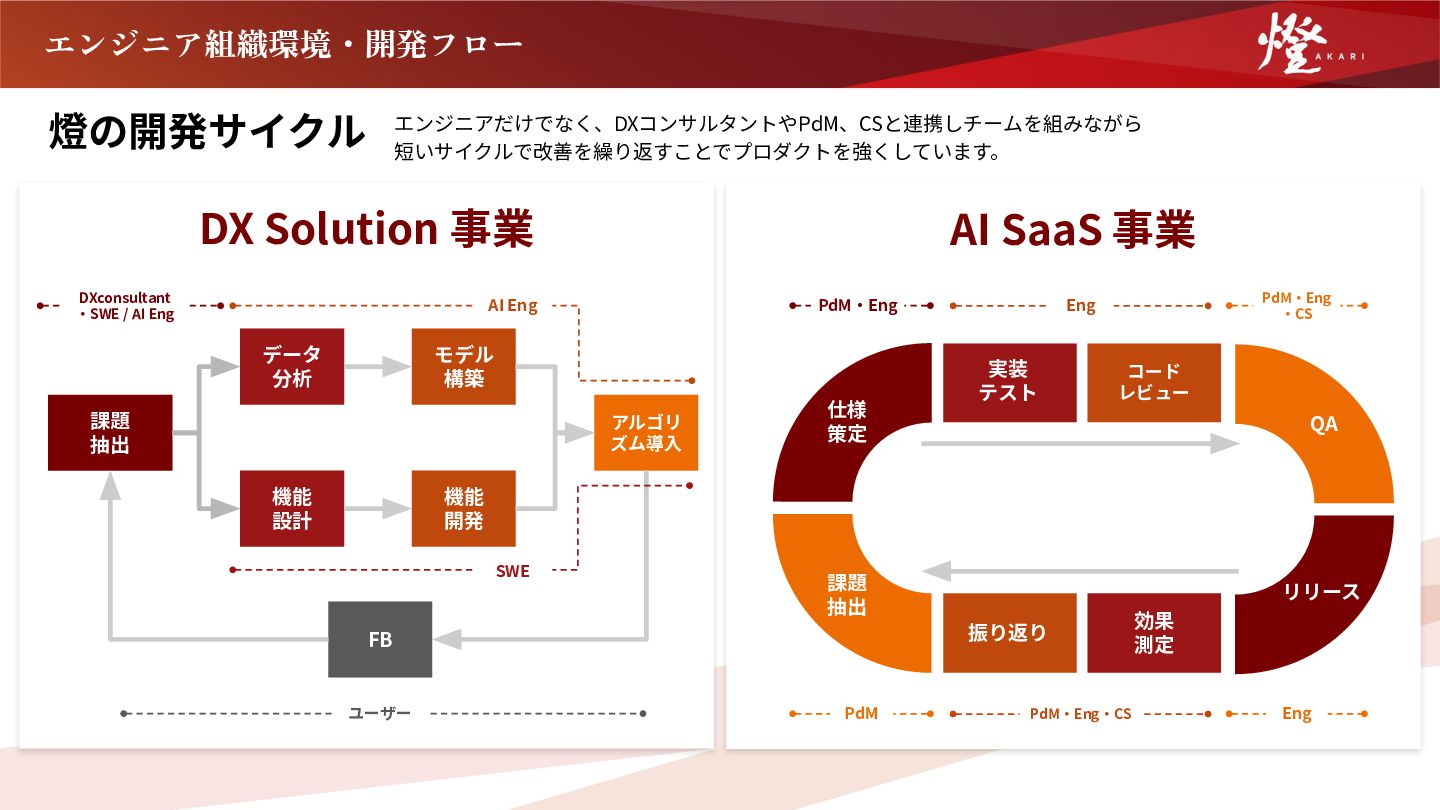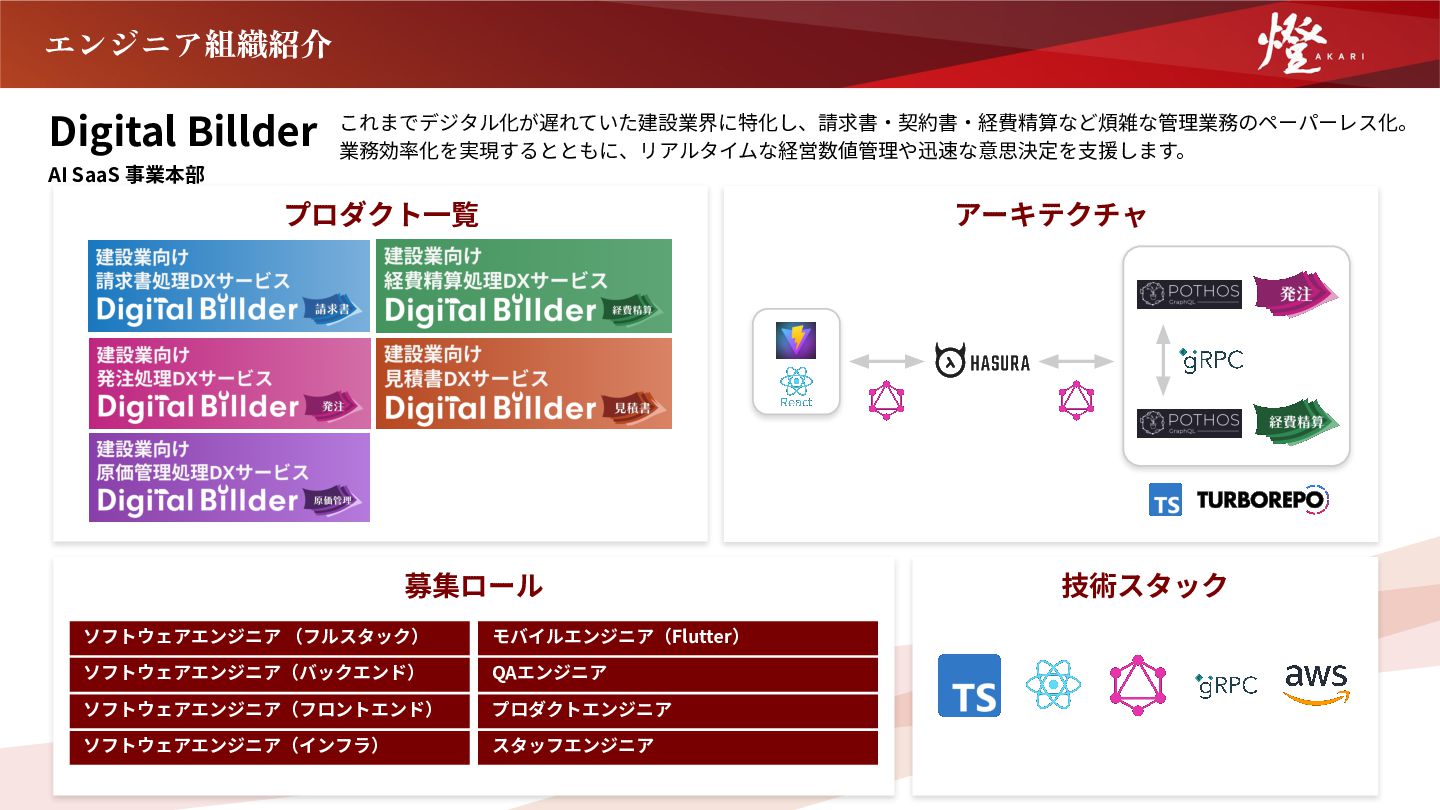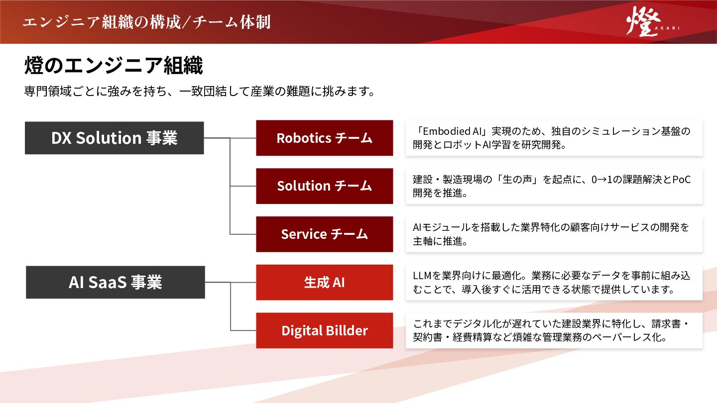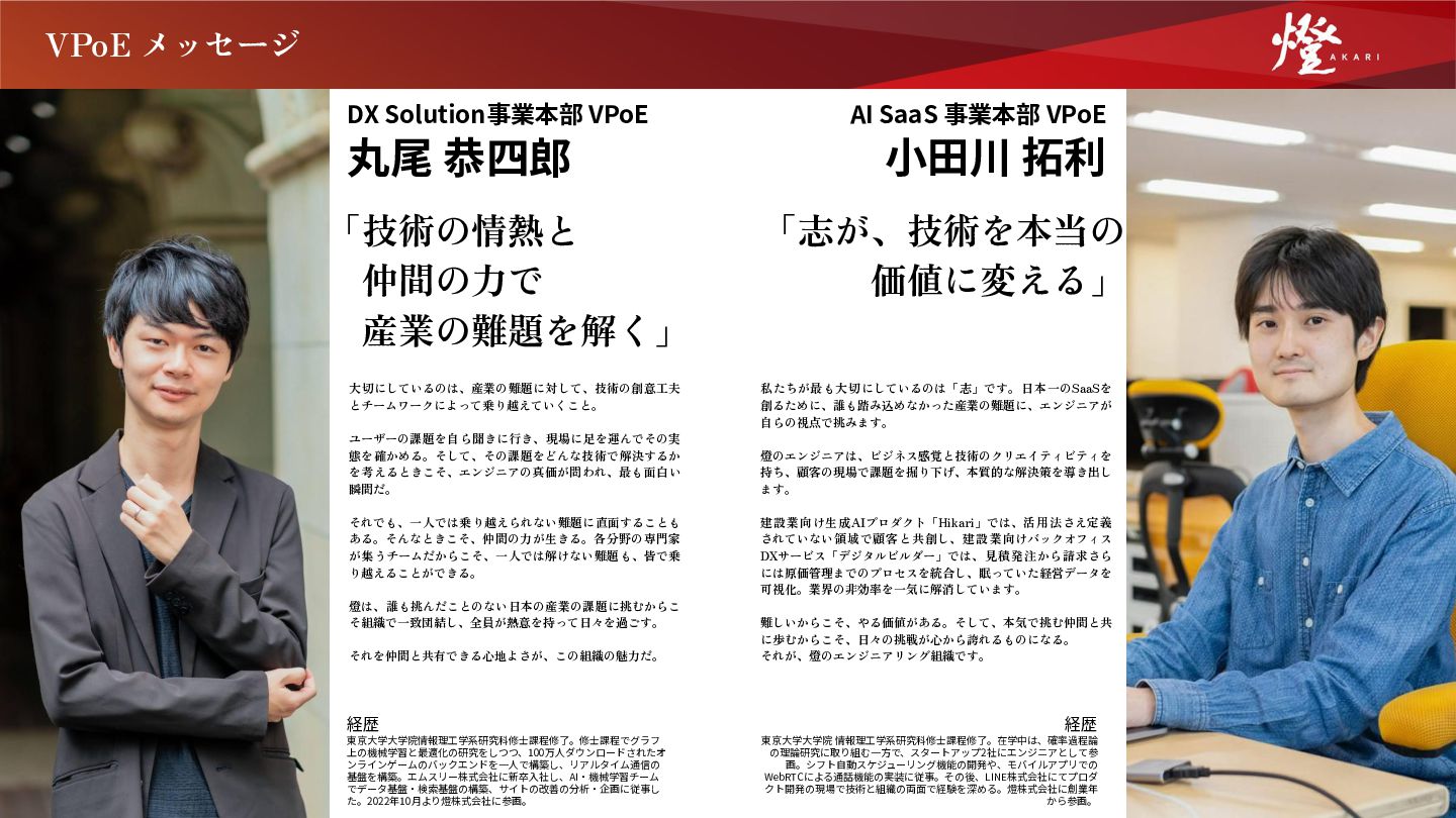 瞬間だ。 それでも、一人では乗り越えられない難題に直面することも ある。そんなときこそ、仲間の力が生きる。各分野の専門家 が集うチームだからこそ、一人では解けない難題も、皆で乗 り越えることができる。 燈は、誰も挑んだことのない日本の産業の課題に挑むからこ そ組織で一致団結し、全員が熱意を持って日々を過ごす。 それを仲間と共有できる心地よさが、この組織の魅力だ。 DX Solution事業本部 VPoE 丸尾 恭四郎 経歴 東京⼤学⼤学院情報理⼯学系研究科修⼠課程修了。修⼠課程でグラフ 上の機械学習と最適化の研究をしつつ、100万⼈ダウンロードされたオ ンラインゲームのバックエンドを⼀⼈で構築し、リアルタイム通信の 基盤を構築。エムスリー株式会社に新卒⼊社し、AI‧機械学習チーム でデータ基盤‧検索基盤の構築、サイトの改善の分析‧企画に従事し た。2022年10⽉より燈株式会社に参画。 「志が、技術を本当の  価値に変える」 私たちが最も大切にしているのは「志」です。日本一のSaaSを 創るために、誰も踏み込めなかった産業の難題に、エンジニアが 自らの視点で挑みます。 燈のエンジニアは、ビジネス感覚と技術のクリエイティビティを 持ち、顧客の現場で課題を掘り下げ、本質的な解決策を導き出し ます。 建設業向け生成AIプロダクト「Hikari」では、活用法さえ定義 されていない領域で顧客と共創し、建設業向けバックオフィス DXサービス「デジタルビルダー」では、見積発注から請求さら には原価管理までのプロセスを統合し、眠っていた経営データを 可視化。業界の非効率を一気に解消しています。 難しいからこそ、やる価値がある。そして、本気で挑む仲間と共 に歩むからこそ、日々の挑戦が心から誇れるものになる。 それが、燈のエンジニアリング組織です。 AI SaaS 事業本部 VPoE ⼩⽥川 拓利 経歴 東京⼤学⼤学院 情報理⼯学系研究科修⼠課程修了。在学中は、確率過程論 の理論研究に取り組む⼀⽅で、スタートアップ2社にエンジニアとして参 画。シフト⾃動スケジューリング機能の開発や、モバイルアプリでの WebRTCによる通話機能の実装に従事。その後、LINE株式会社にてプロダ クト開発の現場で技術と組織の両⾯で経験を深める。燈株式会社に創業年 から参画。