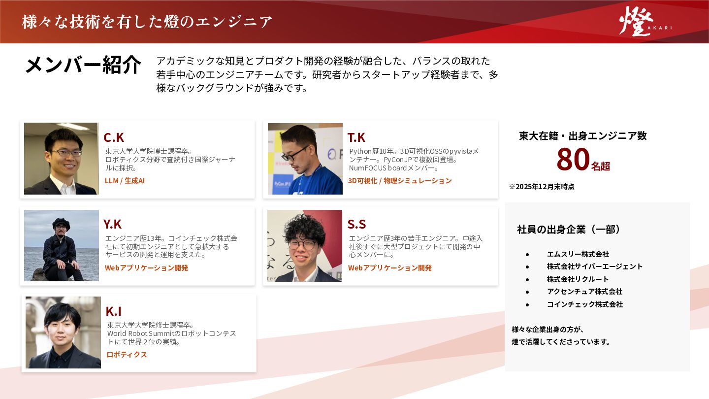 エムスリー株式会社 • 株式会社サイバーエージェント • 株式会社リクルート • アクセンチュア株式会社 • コインチェック株式会社 様々な企業出⾝の⽅が、 燈で活躍してくださっています。 ※2025年12⽉末時点 メンバー紹介 アカデミックな知⾒とプロダクト開発の経験が融合した、バランスの取れた 若⼿中⼼のエンジニアチームです。研究者からスタートアップ経験者まで、多 様なバックグラウンドが強みです。 東京⼤学 在籍‧出⾝ T.K Python歴10年。3D可視化OSSのpyvistaメ ンテナー。PyConJPで複数回登壇。 NumFOCUS boardメンバー。 C.K 東京⼤学⼤学院博⼠課程卒。 ロボティクス分野で査読付き国際ジャーナ ルに採択。 LLM / ⽣成AI S.S エンジニア歴3年の若⼿エンジニア。中途⼊ 社後すぐに⼤型プロジェクトにて開発の中 ⼼メンバーに。 Webアプリケーション開発 Y.K エンジニア歴13年。コインチェック株式会 社にて初期エンジニアとして急拡⼤する サービスの開発と運⽤を⽀えた。 Webアプリケーション開発 3D可視化 / 物理シミュレーション 東⼤在籍‧出⾝エンジニア数 80名超
