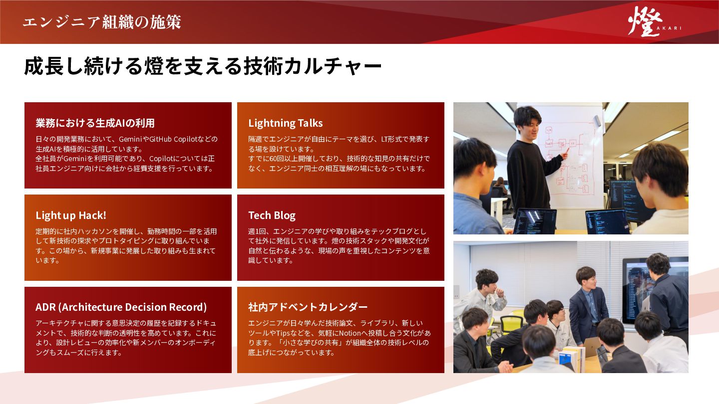 隔週でエンジニアが⾃由にテーマを選び、LT形式で発表す る場を設けています。 すでに60回以上開催しており、技術的な知⾒の共有だけで なく、エンジニア同⼠の相互理解の場にもなっています。 Light up Hack! 定期的に社内ハッカソンを開催し、勤務時間の⼀部を活⽤ して新技術の探求やプロトタイピングに取り組んでいま す。この場から、新規事業に発展した取り組みも⽣まれて います。 Tech Blog 週1回、エンジニアの学びや取り組みをテックブログとし て社外に発信しています。燈の技術スタックや開発⽂化が ⾃然と伝わるような、現場の声を重視したコンテンツを意 識しています。 ADR (Architecture Decision Record) アーキテクチャに関する意思決定の履歴を記録するドキュ メントで、技術的な判断の透明性を⾼めています。これに より、設計レビューの効率化や新メンバーのオンボーディ ングもスムーズに⾏えます。 社内アドベントカレンダー エンジニアが⽇々学んだ技術論⽂、ライブラリ、新しい ツールやTipsなどを、気軽にNotionへ投稿し合う⽂化があ ります。「⼩さな学びの共有」が組織全体の技術レベルの 底上げにつながっています。