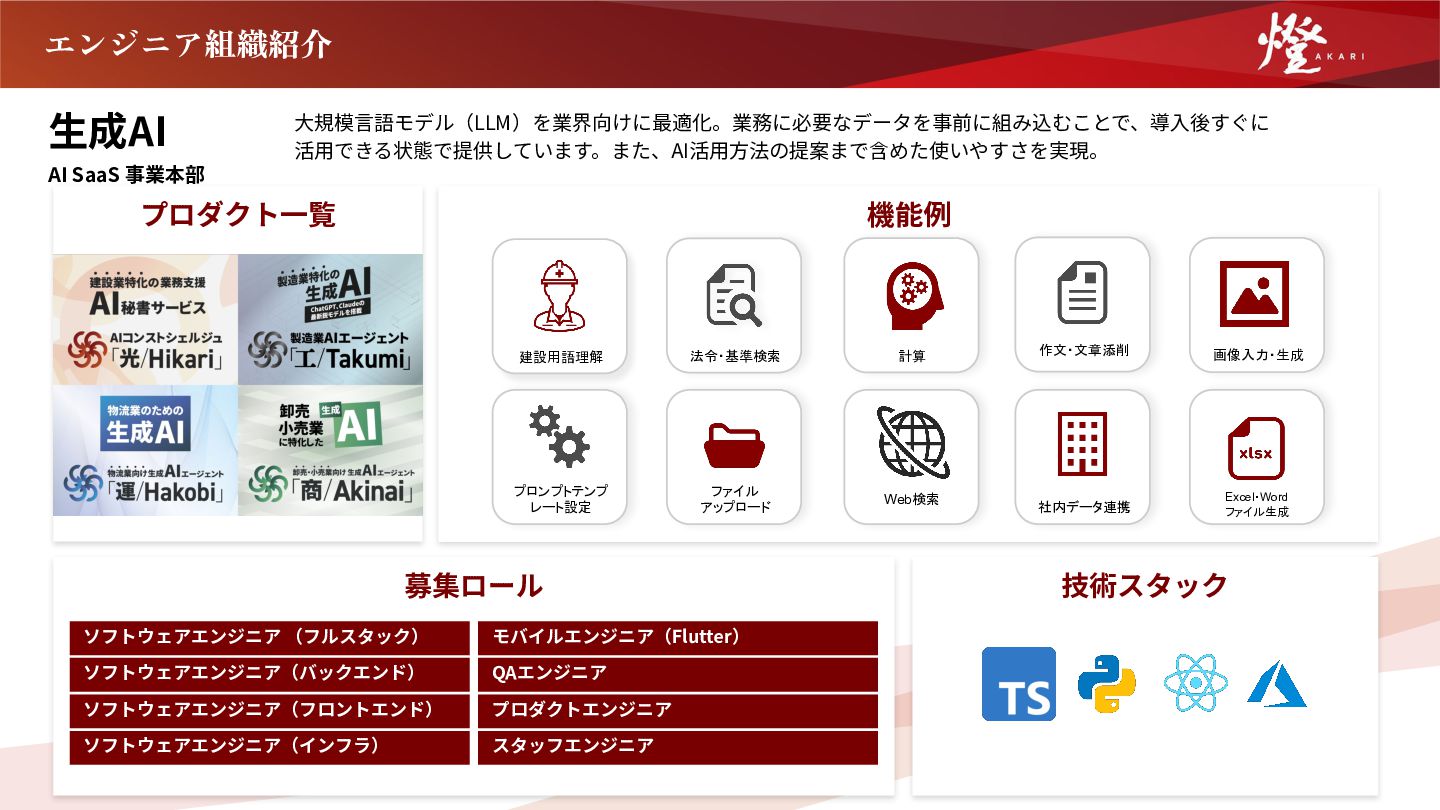 技術スタック エンジニア組織紹介 機能例 ソフトウェアエンジニア (フルスタック) ソフトウェアエンジニア(バックエンド) ソフトウェアエンジニア(フロントエンド) ソフトウェアエンジニア(インフラ) プロダクトエンジニア 法令・基準検索 作文・文章添削 プロンプトテンプ レート設定 建設用語理解 計算 ファイル アップロード 社内データ連携 画像入力・生成 Excel・Word ファイル生成 Web検索 スタッフエンジニア