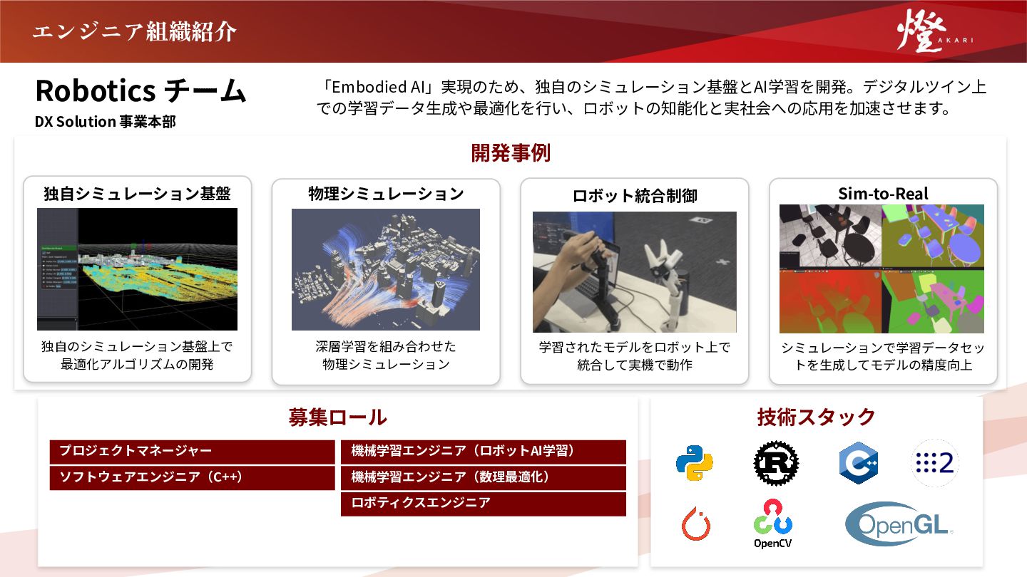 機械学習エンジニア(ロボットAI学習) 機械学習エンジニア(数理最適化) 技術スタック エンジニア組織紹介 プロジェクトマネージャー ソフトウェアエンジニア(C++) ロボティクスエンジニア 独⾃シミュレーション基盤 独⾃のシミュレーション基盤上で 最適化アルゴリズムの開発 物理シミュレーション 深層学習を組み合わせた 物理シミュレーション Sim-to-Real シミュレーションで学習データセッ トを⽣成してモデルの精度向上 ロボット統合制御 学習されたモデルをロボット上で 統合して実機で動作