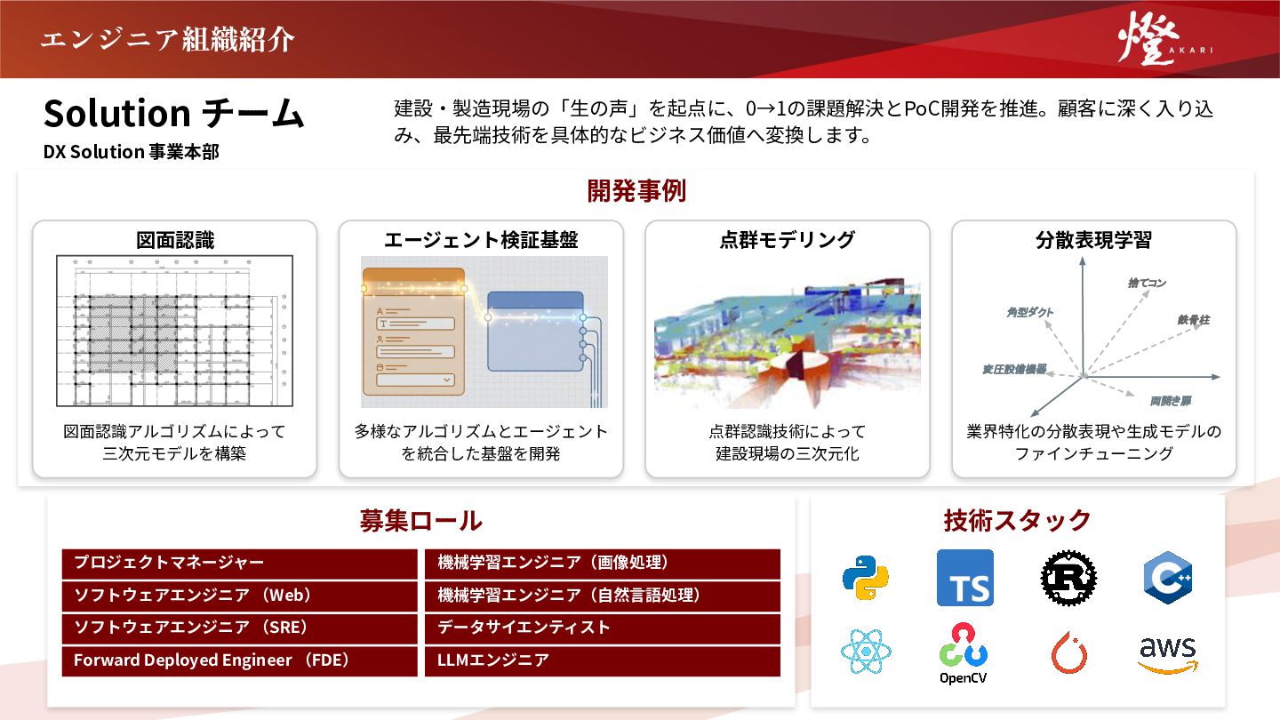 機械学習エンジニア(⾃然⾔語処理) 技術スタック エンジニア組織紹介 プロジェクトマネージャー ソフトウェアエンジニア (Web) ソフトウェアエンジニア (SRE) データサイエンティスト LLMエンジニア エージェント検証基盤 多様なアルゴリズムとエージェント を統合した基盤を開発 点群モデリング 点群認識技術によって 建設現場の三次元化 分散表現学習 業界特化の分散表現や⽣成モデルの ファインチューニング 鉄骨柱 捨てコン 両開き扉 角型ダクト 変圧設備機器 図⾯認識 図⾯認識アルゴリズムによって 三次元モデルを構築 Forward Deployed Engineer (FDE)