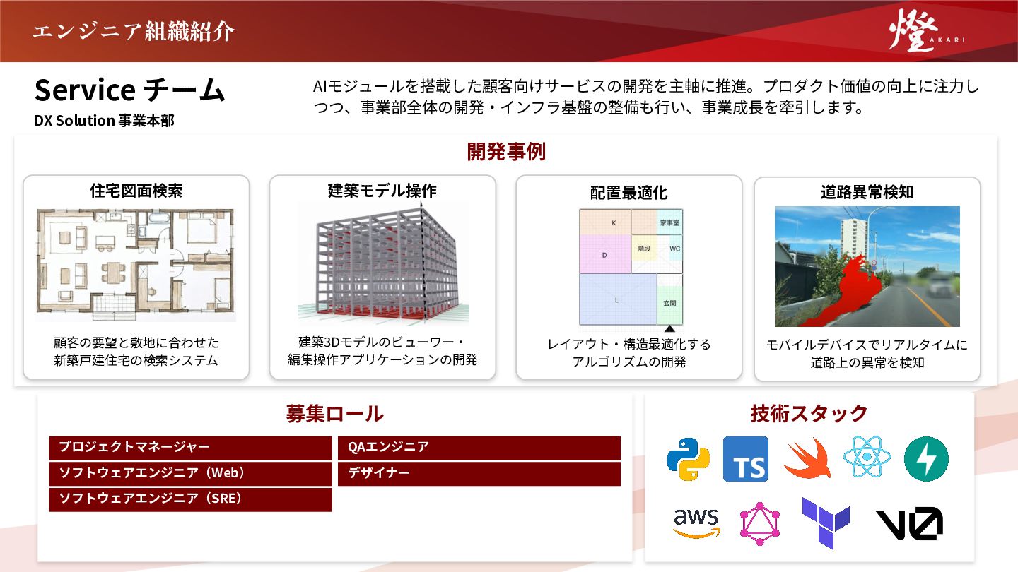 デザイナー 技術スタック エンジニア組織紹介 プロジェクトマネージャー ソフトウェアエンジニア(Web) ソフトウェアエンジニア(SRE) 住宅図⾯検索 顧客の要望と敷地に合わせた 新築⼾建住宅の検索システム 画像仮 建築モデル操作 道路異常検知 モバイルデバイスでリアルタイムに 道路上の異常を検知 建築3Dモデルのビューワー‧ 編集操作アプリケーションの開発 配置最適化 レイアウト‧構造最適化する アルゴリズムの開発