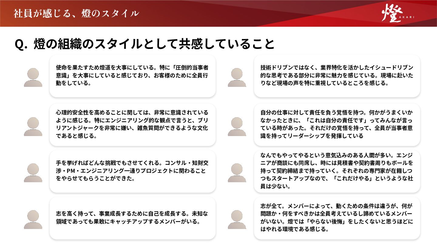 ⼿を挙げればどんな挑戦でもさせてくれる。コンサル‧知財交 渉‧PM‧エンジニアリング⼀通りプロジェクトに関わること をやらせてもらうことができた。 技術ドリブンではなく、業界特化を活かしたイシュードリブン 的な思考である部分に⾮常に魅⼒を感じている。現場に赴いた りなど現場の声を特に重視しているところを感じる。 ⾃分の仕事に対して責任を負う覚悟を持つ。何かがうまくいか なかったときに、「これは⾃分の責任です」ってみんなが⾔っ ている時があった。それだけの覚悟を持って、全員が当事者意 識を持ってリーダーシップを発揮している なんでもやってやるという意気込みのある⼈間が多い。エンジ ニアが商談にも同席し、時には⾒積書や契約書周りもボールを 持って契約締結まで持っていく。それぞれの専⾨家が在籍しつ つもスタートアップなので、「これだけやる」というような社 員は少ない。 志を⾼く持って、事業成⻑するために⾃⼰を成⻑する。未知な 領域であっても果敢にキャッチアップするメンバーがいる。 志が全て。メンバーによって、動くための条件は違うが、何が 問題か‧何をすべきかは全員考えているし諦めているメンバー がいない。燈では「やらない後悔」をしたくないと思うほどに はやれる環境である感じる。