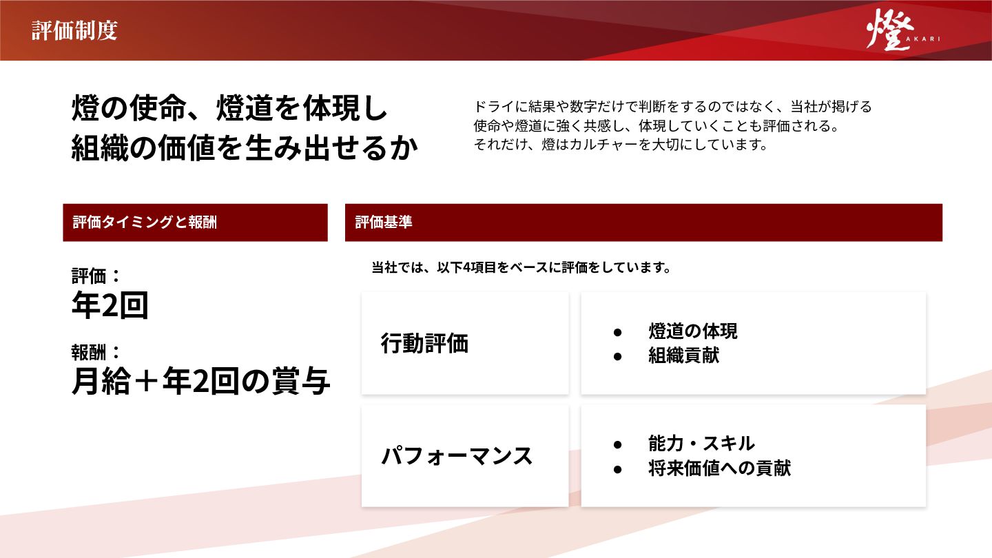 について理解し、⼠気を⾼めます。 締め会  四半期末に全社員で集まり、各四半期の成果や成功事 例を共有し、表彰式も開催されます。 各四半期の努⼒を称え合い、次の四半期へのモチベー ションを⾼めます。 全社総会 年末に全社員がホテルなどの会場に集まり、1年間の成 果を共有する全社総会を開催します。 年間の事業の振り返り、表彰式の開催などを通じて、1 年間の努⼒を称え合い、新たな年へのモチベーション を⾼めます。 ⼣会 毎⽇19時に全社員で集合し、選ばれた1名がその⽇の 燈道を実践したエピソードを共有した後、全社員で燈 道を唱和します。1⽇の締めに全員で顔を合わせ、⽇々 の結束⼒が深まります。 シャッフルランチ 毎週⽉曜⽇の昼にランダムに振り分けられた班の社員 同⼠でランチに⾏きます。部署に関わらず、交流を深 めることができます。最近は⼈数も増えて近隣レスト ランに複数班の燈メンバーが⼀緒になることも。 完全出社制 毎⽇10~19時の完全出社制を採⽤しています。 社員同⼠が顔を合わせてコミュニケーションする機会 を最⼤化し、「⼀致団結」に寄与しています。 ※事情に応じてリモート勤務や時間休の取得なども可 能です