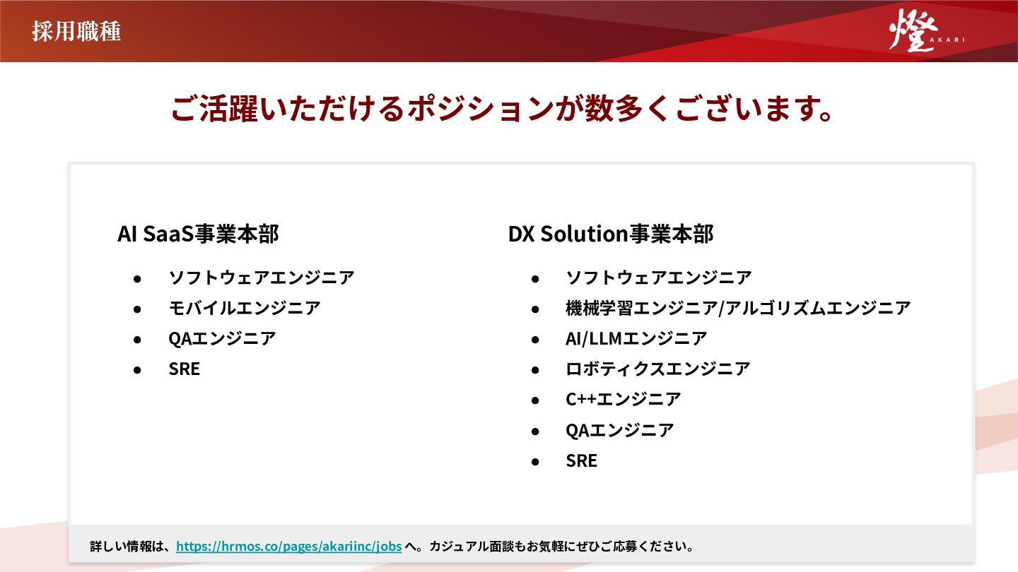 25. 採用職種 ご活躍いただけるポジションが数多くございます。 詳しい情報は、https://hrmos.co/pages/akariinc/jobs へ。カジュアル⾯談もお気軽にぜひご応募ください。 AI SaaS事業本部 • ソフトウェアエンジニア • モバイルエンジニア