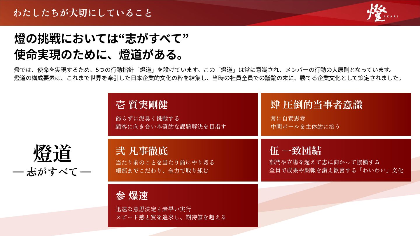 飾らずに泥臭く挑戦する 顧客に向き合い本質的な課題解決を目指す 常に自責思考 中間ボールを主体的に拾う 当たり前のことを当たり前にやり切る 細部までこだわり、全力で取り組む 部門や立場を超えて志に向かって協働する 全員で成果や朗報を讃え歓喜する「わいわい」文化 迅速な意思決定と素早い実行 スピード感と質を追求し、期待値を超える 燈道 志がすべて 燈の挑戦においては“志がすべて” 使命実現のために、燈道がある。 燈では、使命を実現するため、5つの⾏動指針「燈道」を設けています。この「燈道」は常に意識され、メンバーの⾏動の⼤原則となっています。 燈道の構成要素は、これまで世界を牽引した⽇本企業的⽂化の粋を結集し、当時の社員全員での議論の末に、勝てる企業⽂化として策定されました。 わたしたちが大切にしていること