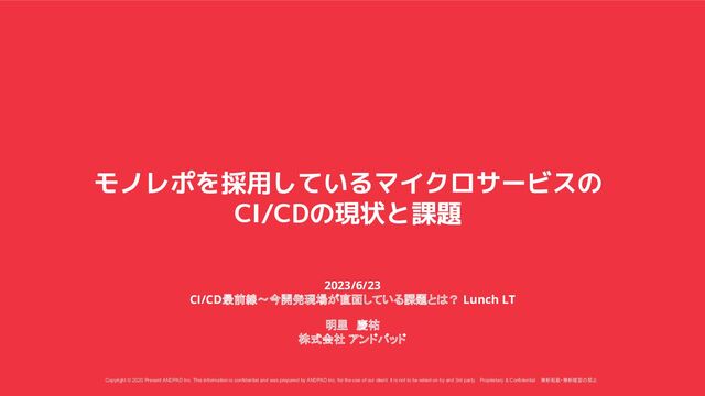 and was prepared by ANDPAD Inc. for the use of our client. It is not to be relied on by and 3rd party. Proprietary & Confidential 無断転載・無断複製の禁止 モノレポを採用しているマイクロサービスの CI/CDの現状と課題 明里 慶祐 株式会社 アンドパッド 2023/6/23 CI/CD最前線〜今開発現場が直面している課題とは? Lunch LT