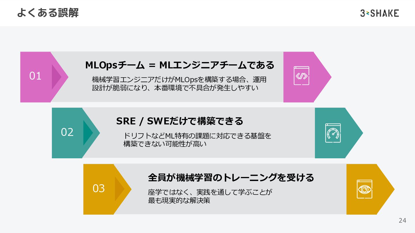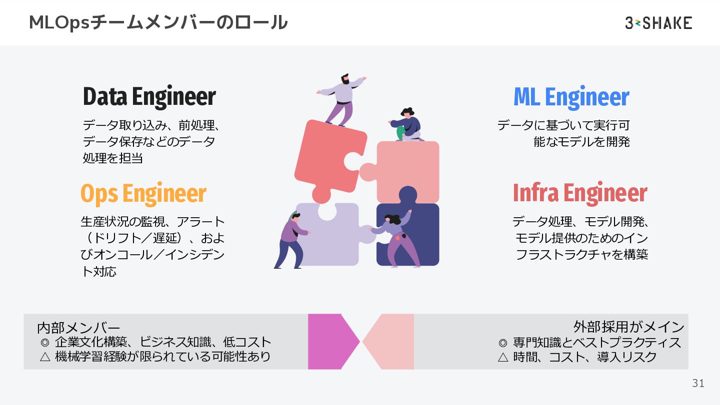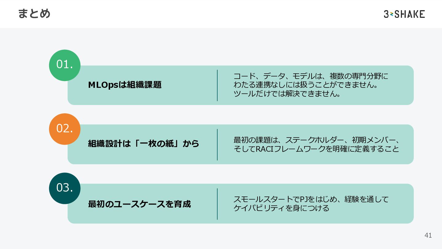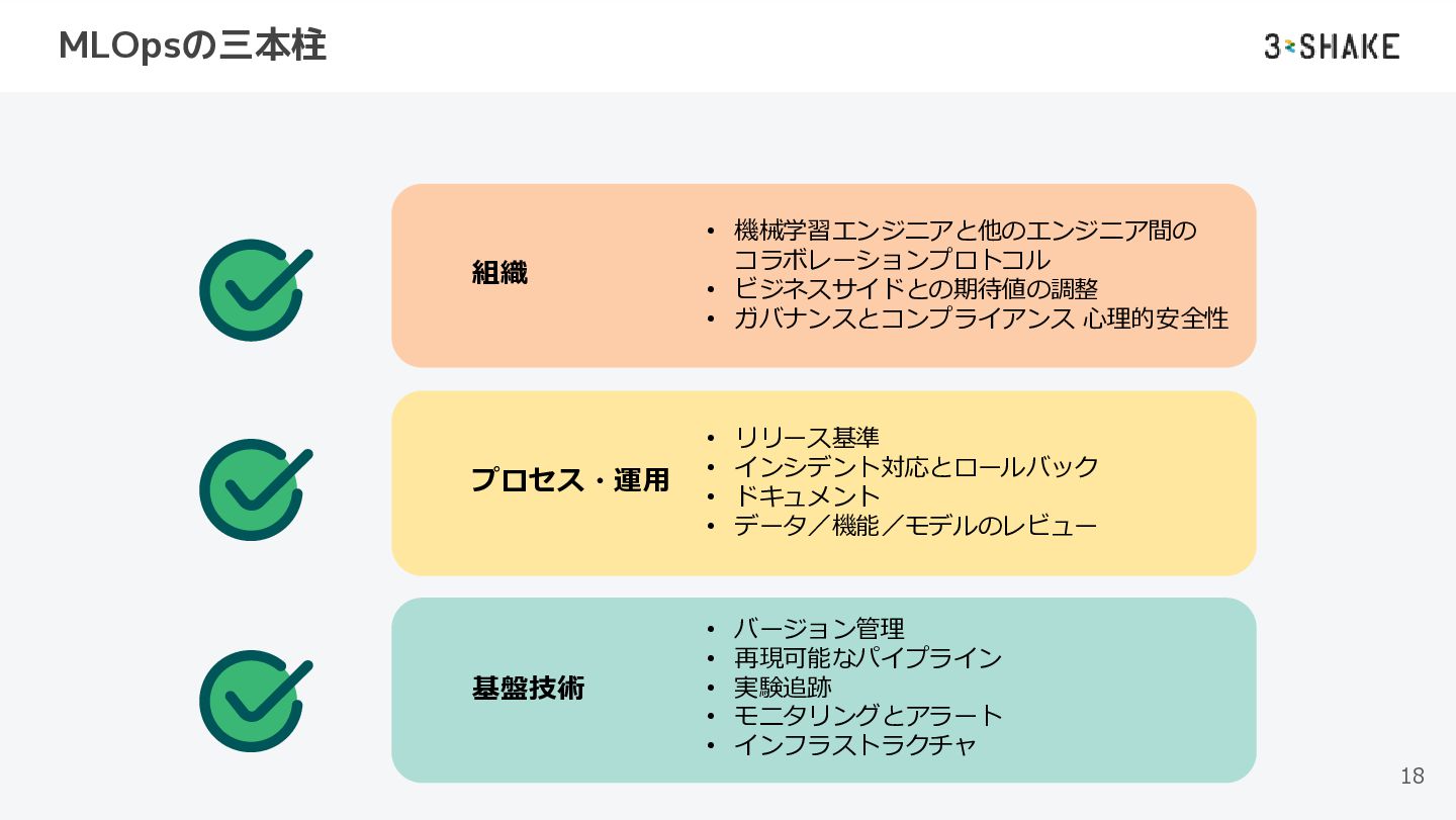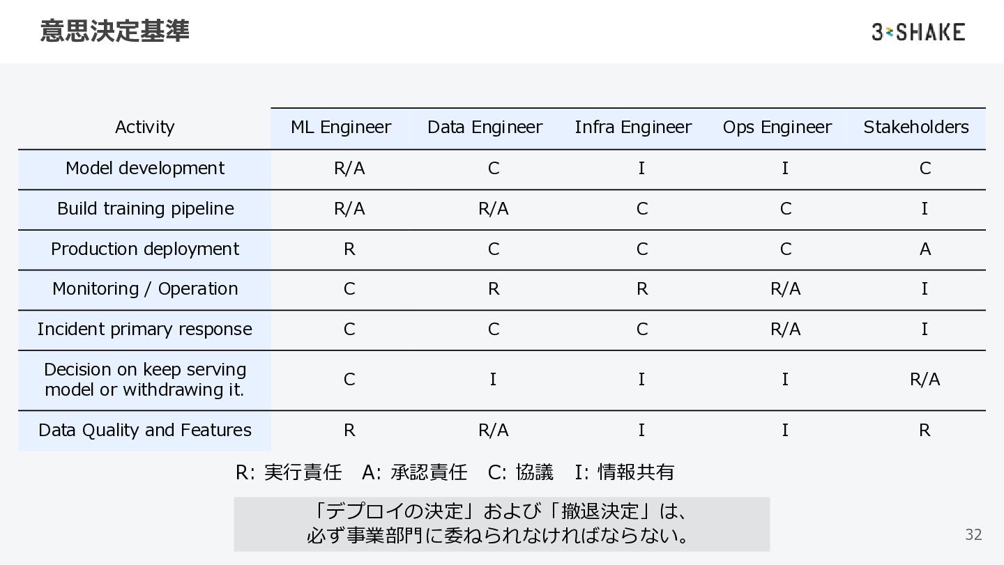 Engineer Stakeholders Model development R/A C I I C Build training pipeline R/A R/A C C I Production deployment R C C C A Monitoring / Operation C R R R/A I Incident primary response C C C R/A I Decision on keep serving model or withdrawing it. C I I I R/A Data Quality and Features R R/A I I R R: 実行責任 A: 承認責任 C: 協議 I: 情報共有 「デプロイの決定」および「撤退決定」は、 必ず事業部門に委ねられなければならない。