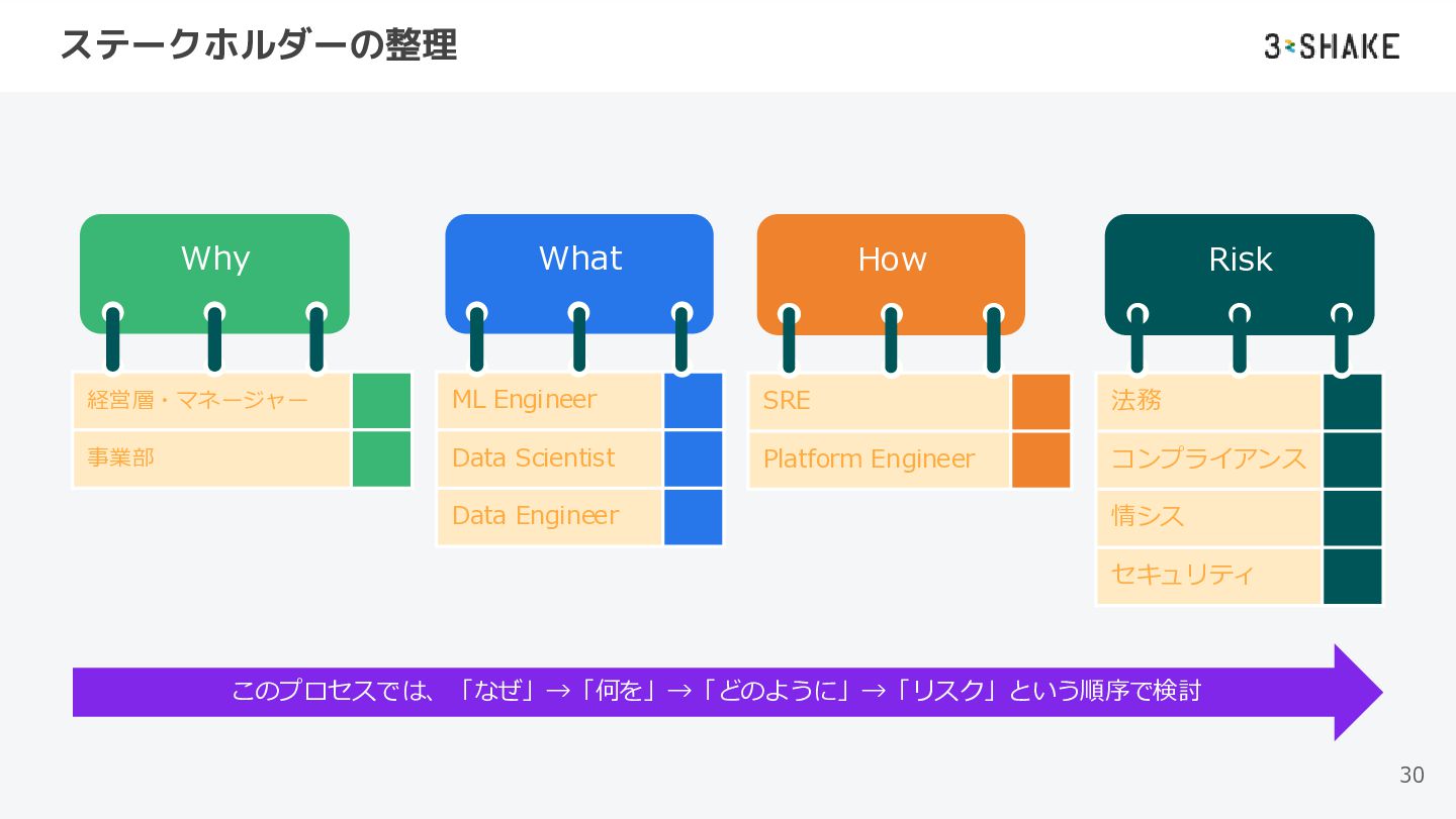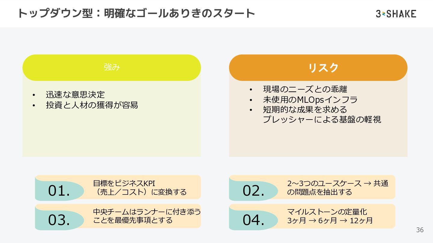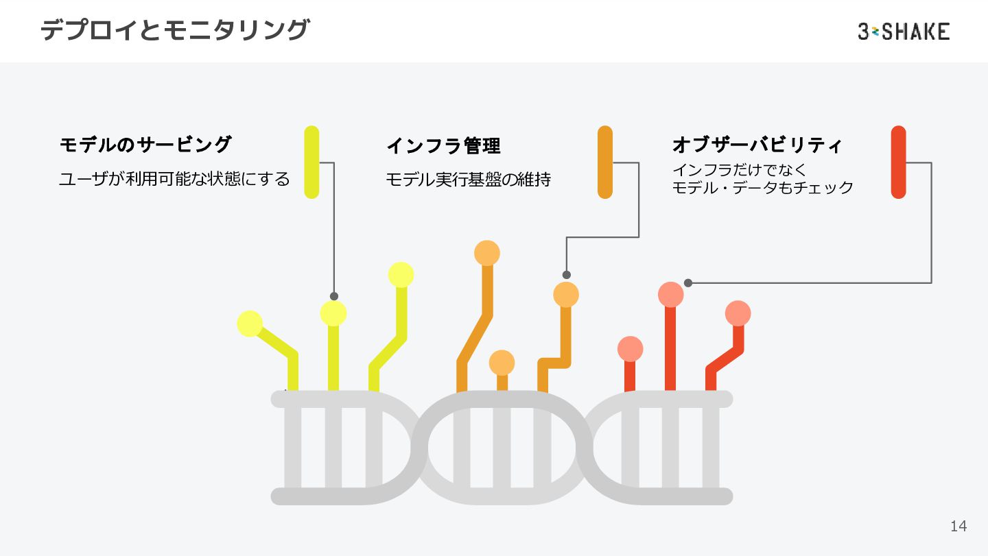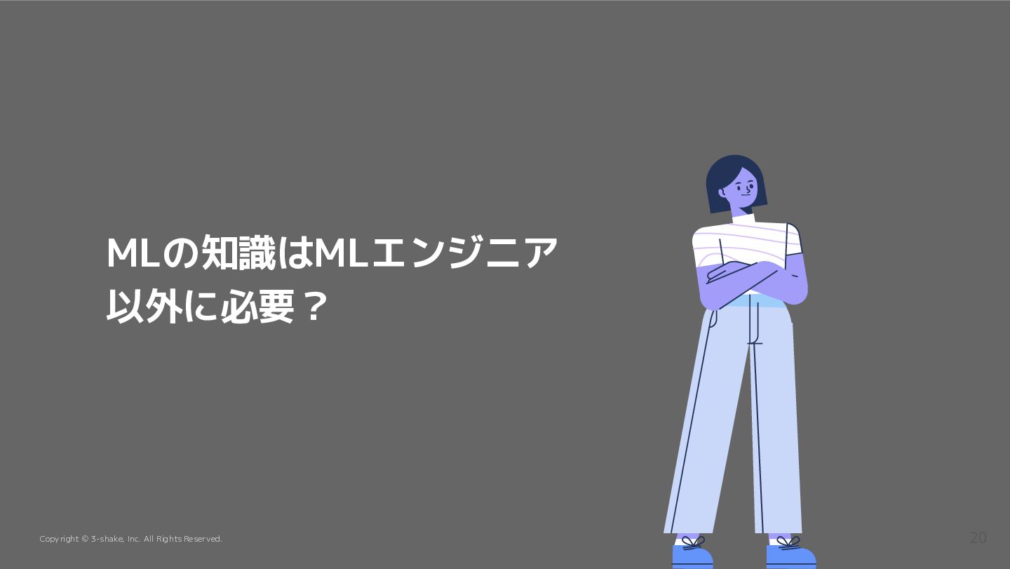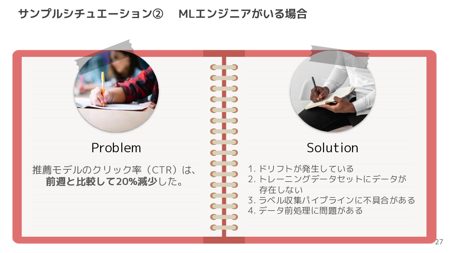 Engineer Stakeholders Model development R/A C I I C Build training pipeline R/A R/A C C I Production deployment R C C C A Monitoring / Operation C R R R/A I Incident primary response C C C R/A I Decision on keep serving model or withdrawing it. C I I I R/A Data Quality and Features R R/A I I R R: 実行責任 A: 承認責任 C: 協議 I: 情報共有 「デプロイの決定」および「撤退決定」は、 必ず事業部門に委ねられなければならない。
