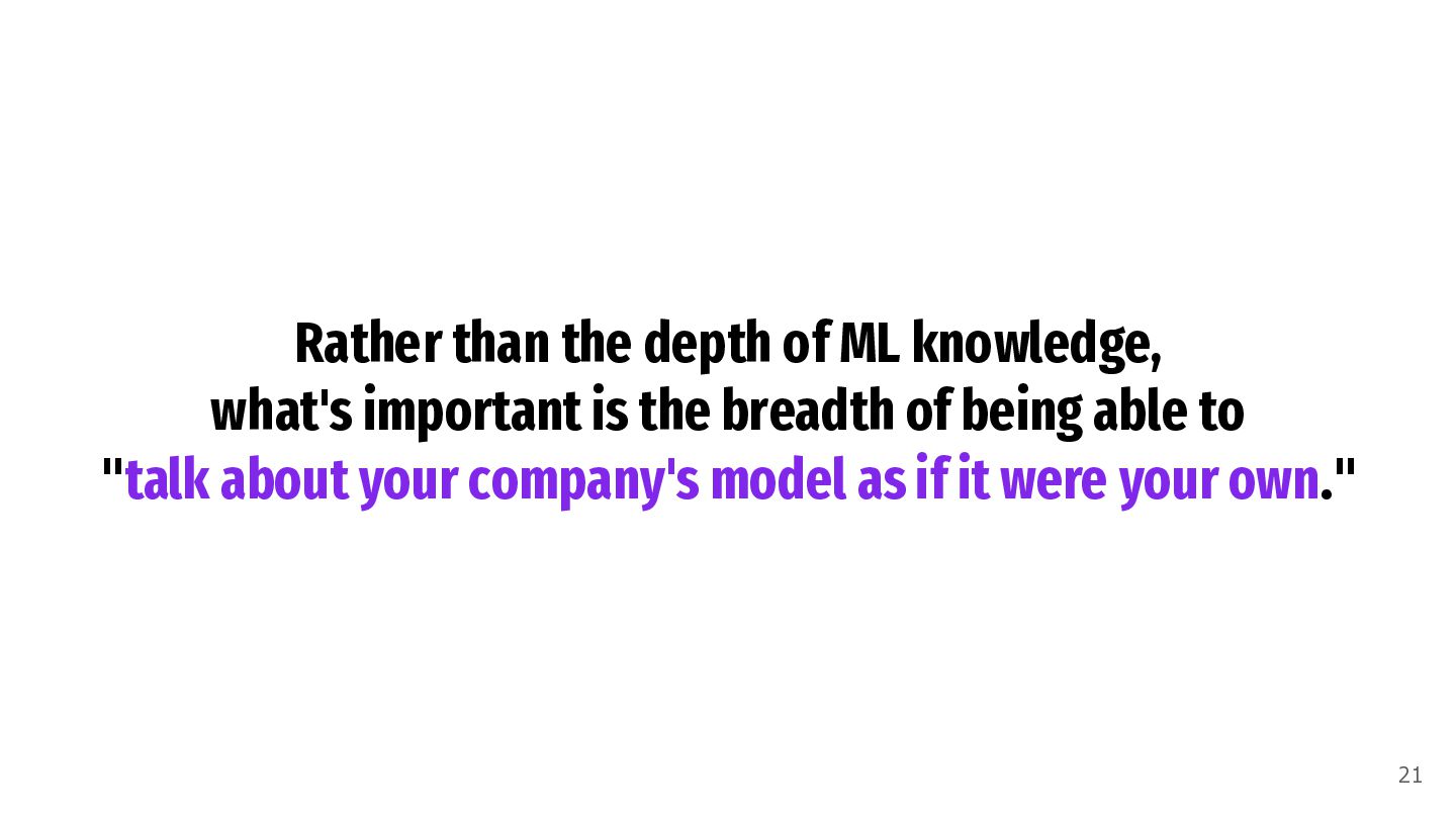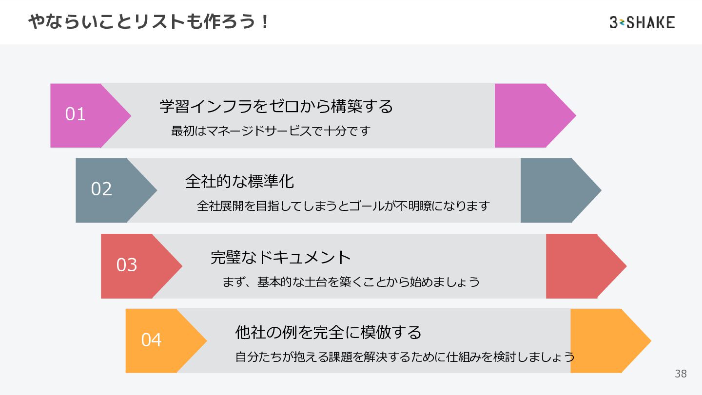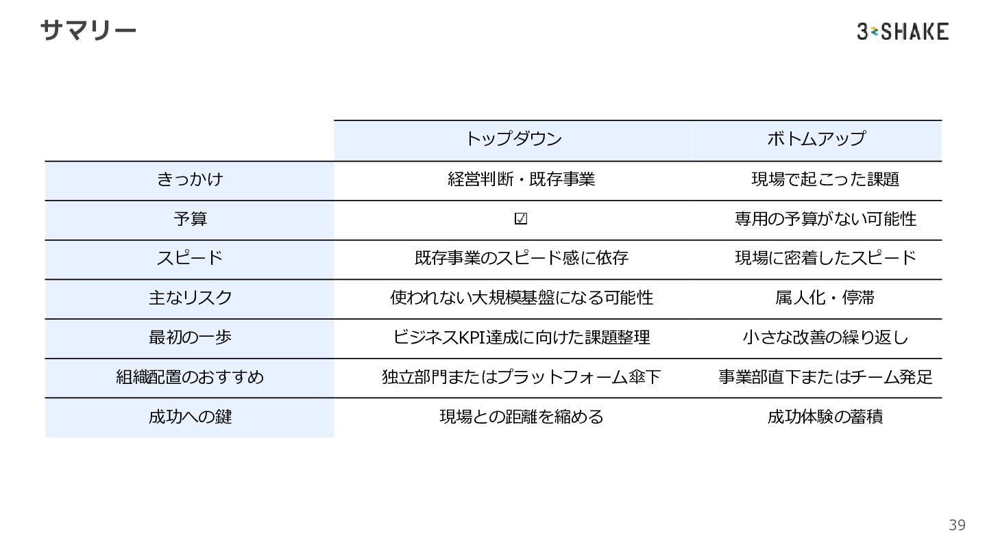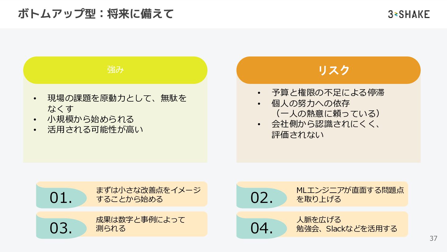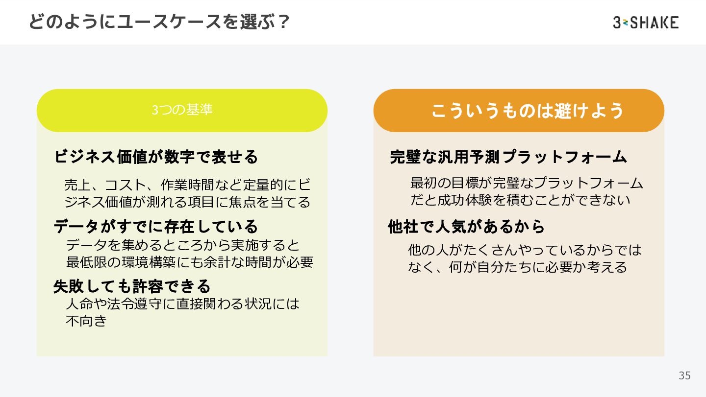 Engineer Stakeholders Model development R/A C I I C Build training pipeline R/A R/A C C I Production deployment R C C C A Monitoring / Operation C R R R/A I Incident primary response C C C R/A I Decision on keep serving model or withdrawing it. C I I I R/A Data Quality and Features R R/A I I R R: 実行責任 A: 承認責任 C: 協議 I: 情報共有 「デプロイの決定」および「撤退決定」は、 必ず事業部門に委ねられなければならない。