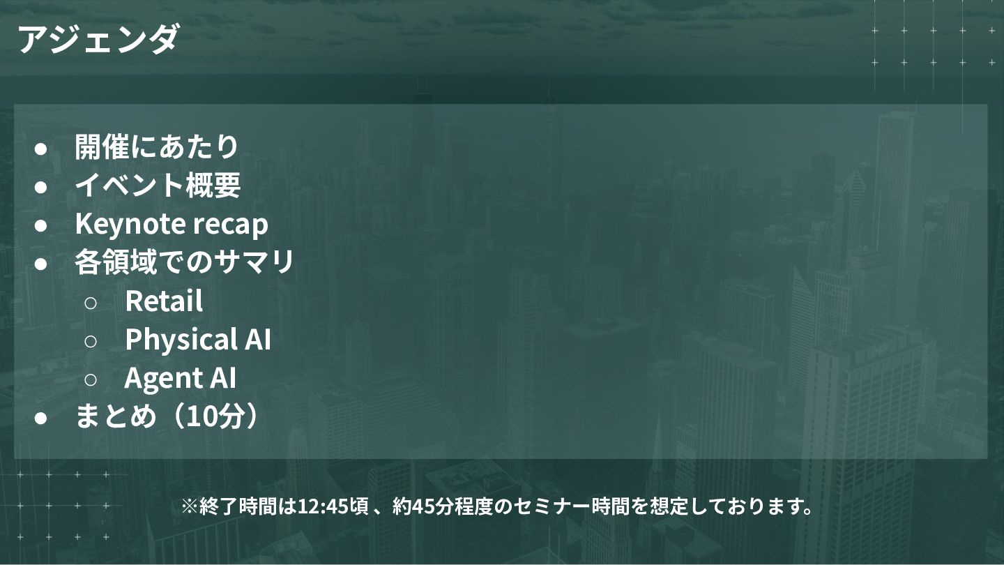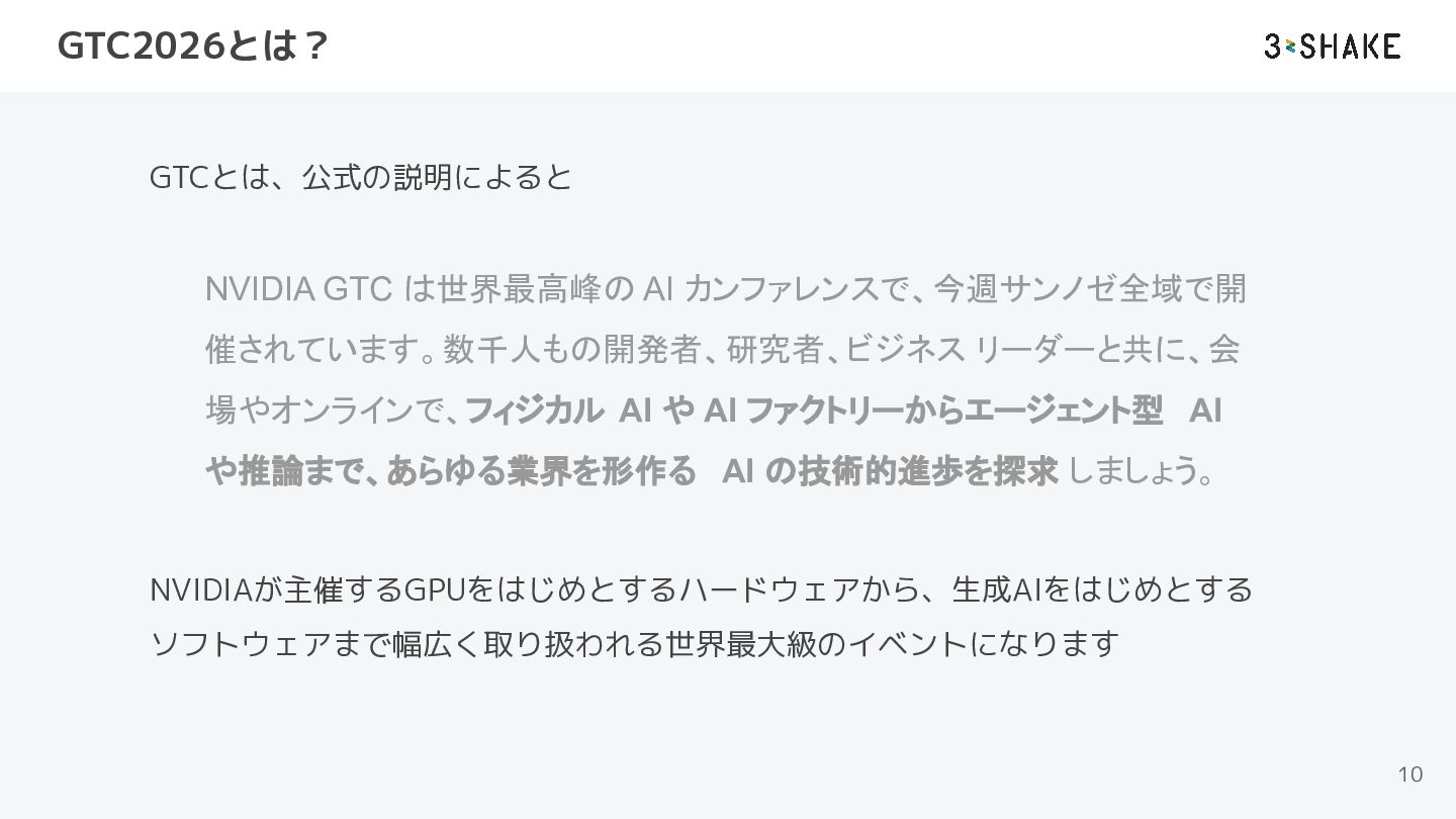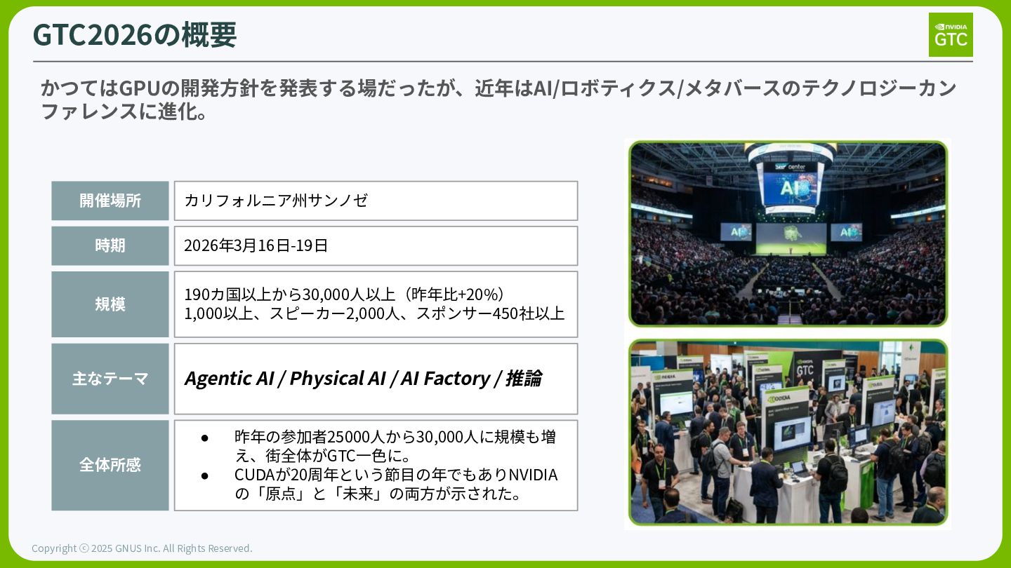 場やオンラインで、フィジカル AI や AI ファクトリーからエージェント型 AI や推論まで、あらゆる業界を形作る AI の技術的進歩を探求 しましょう。 NVIDIAが主催するGPUをはじめとするハードウェアから、生成AIをはじめとする ソフトウェアまで幅広く取り扱われる世界最大級のイベントになります