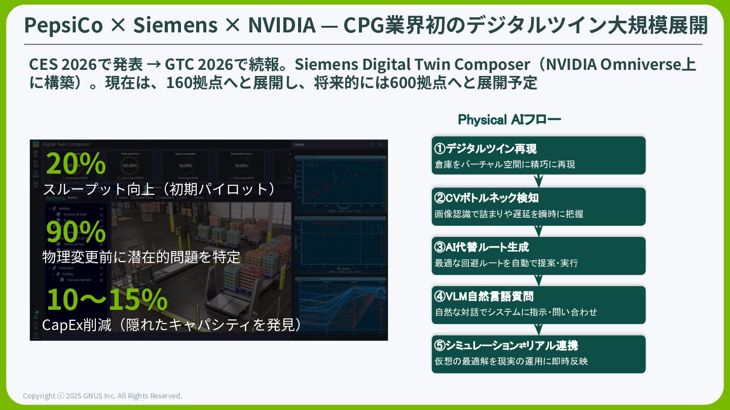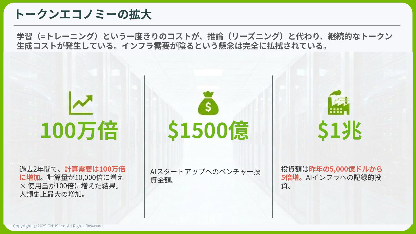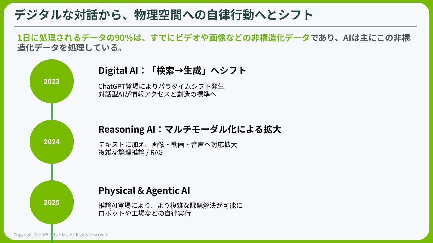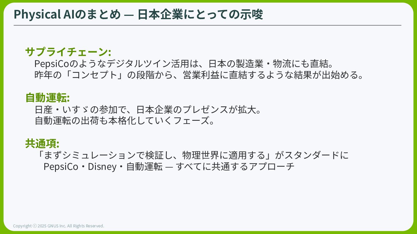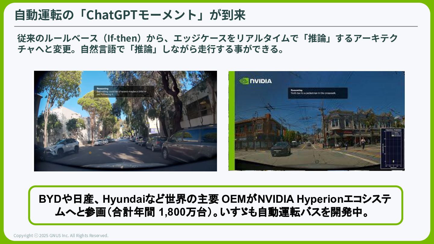 ⓒ 2025 GNUS Inc. All Rights Reserved. ⾃動運転の「ChatGPTモーメント」が到来 従来のルールベース(If-then)から、エッジケースをリアルタイムで「推論」するアーキテク チャへと変更。⾃然⾔語で「推論」しながら⾛⾏する事ができる。 BYDや日産、Hyundaiなど世界の主要 OEMがNVIDIA Hyperionエコシステ ムへと参画(合計年間 1,800万台)。いすゞも自動運転バスを開発中。