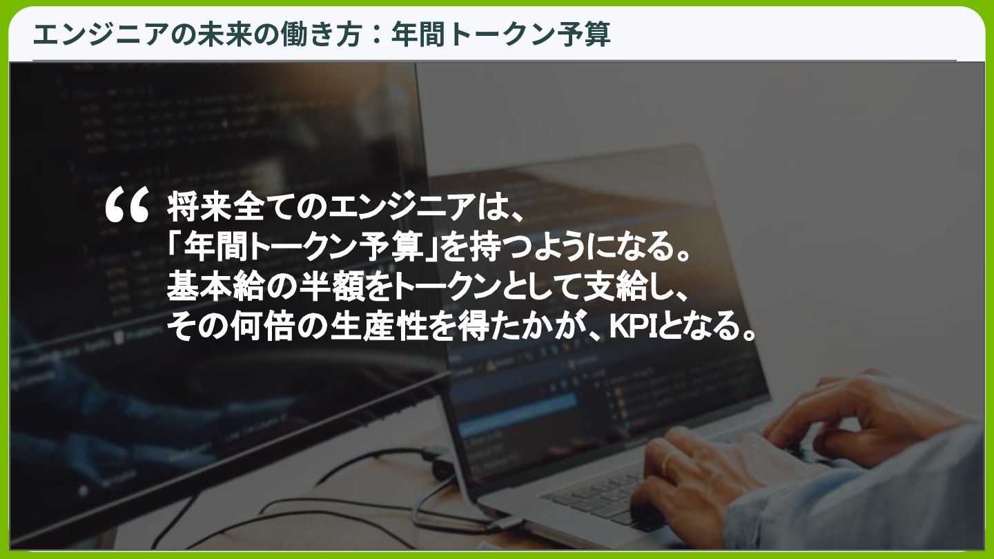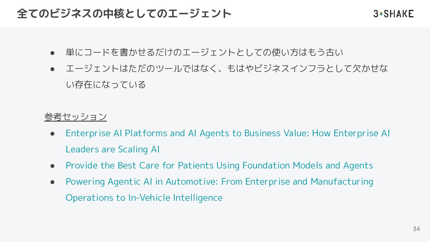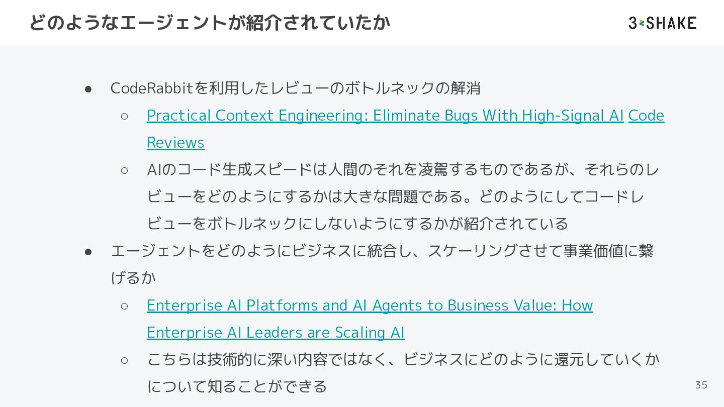 With High-Signal AI Code Reviews ◦ AIのコード生成スピードは人間のそれを凌駕するものであるが、それらのレ ビューをどのようにするかは大きな問題である。どのようにしてコードレ ビューをボトルネックにしないようにするかが紹介されている • エージェントをどのようにビジネスに統合し、スケーリングさせて事業価値に繋 げるか ◦ Enterprise AI Platforms and AI Agents to Business Value: How Enterprise AI Leaders are Scaling AI ◦ こちらは技術的に深い内容ではなく、ビジネスにどのように還元していくか について知ることができる