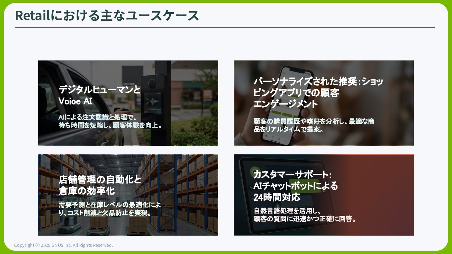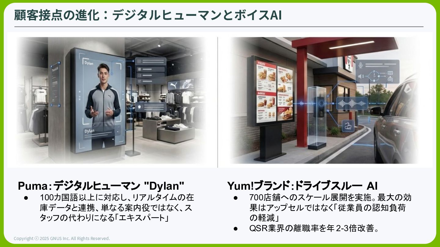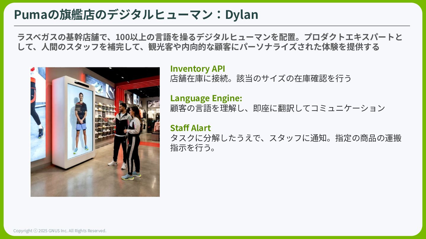 ⓒ 2025 GNUS Inc. All Rights Reserved. Pumaの旗艦店のデジタルヒューマン:Dylan ラスベガスの基幹店舗で、100以上の⾔語を操るデジタルヒューマンを配置。プロダクトエキスパートと して、⼈間のスタッフを補完して、観光客や内向的な顧客にパーソナライズされた体験を提供する Inventory API 店舗在庫に接続。該当のサイズの在庫確認を⾏う Language Engine: 顧客の⾔語を理解し、即座に翻訳してコミュニケーション Staff Alart タスクに分解したうえで、スタッフに通知。指定の商品の運搬 指⽰を⾏う。