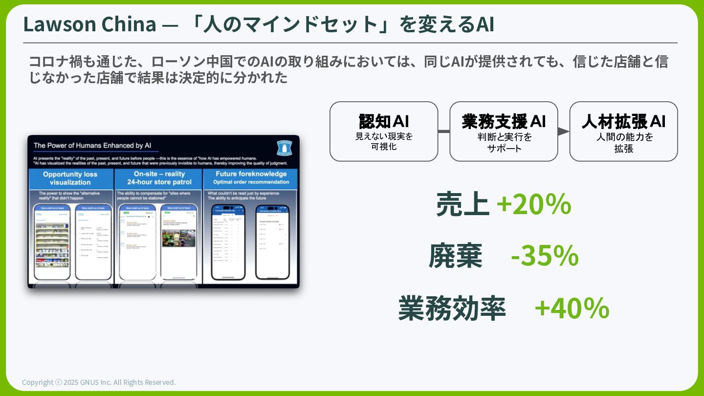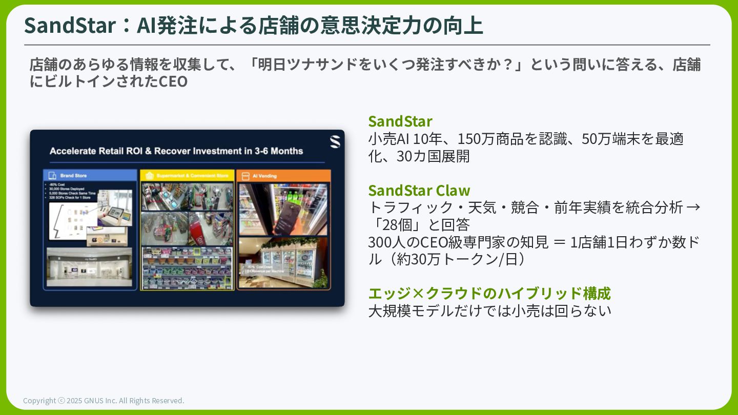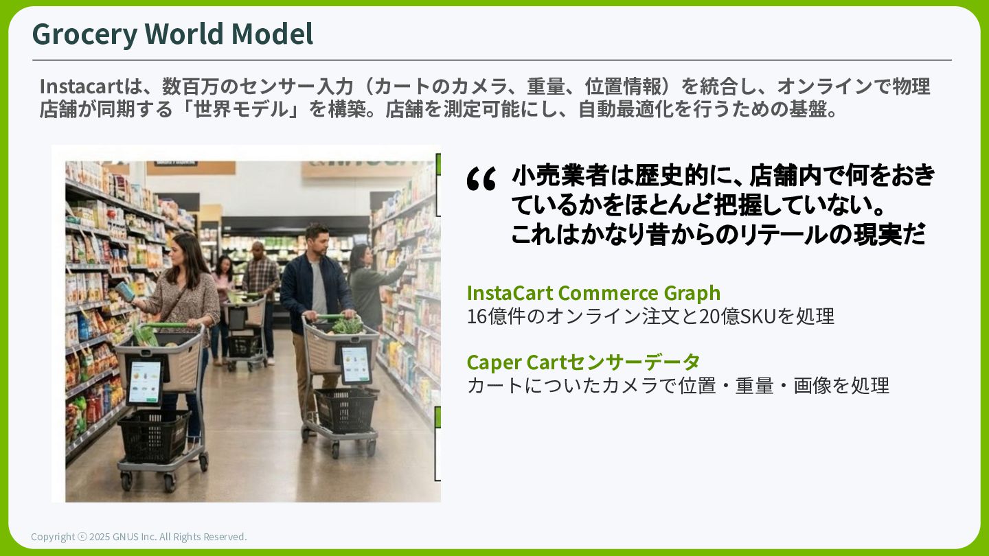 ⓒ 2025 GNUS Inc. All Rights Reserved. Grocery World Model Instacartは、数百万のセンサー⼊⼒(カートのカメラ、重量、位置情報)を統合し、オンラインで物理 店舗が同期する「世界モデル」を構築。店舗を測定可能にし、⾃動最適化を⾏うための基盤。 小売業者は歴史的に、店舗内で何をおき ているかをほとんど把握していない。 これはかなり昔からのリテールの現実だ “ InstaCart Commerce Graph 16億件のオンライン注⽂と20億SKUを処理 Caper Cartセンサーデータ カートについたカメラで位置‧重量‧画像を処理